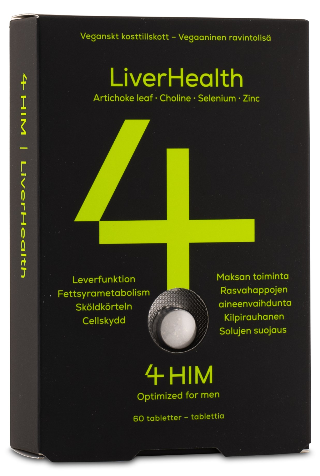Giv kroppen støtte med 4HIM LiverHealth, et kosttilskud, der er specielt udviklet til mænd. Med ingredienserne cholin, zink, selen og vitaminerne E, C og B6 samt ekstrakt fra artiskokblade. Cholin støtter normal leverfunktion og fedtomsætning, mens zink bidrager til normal stofskifte af fedtsyrer. Zink, vitamin E og C beskytter cellerne mod oxidativ stress. Vitamin B6 fremmer normal protein- og glykogenmetabolisme, og selen støtter normal skjoldbruskkirtelfunktion.