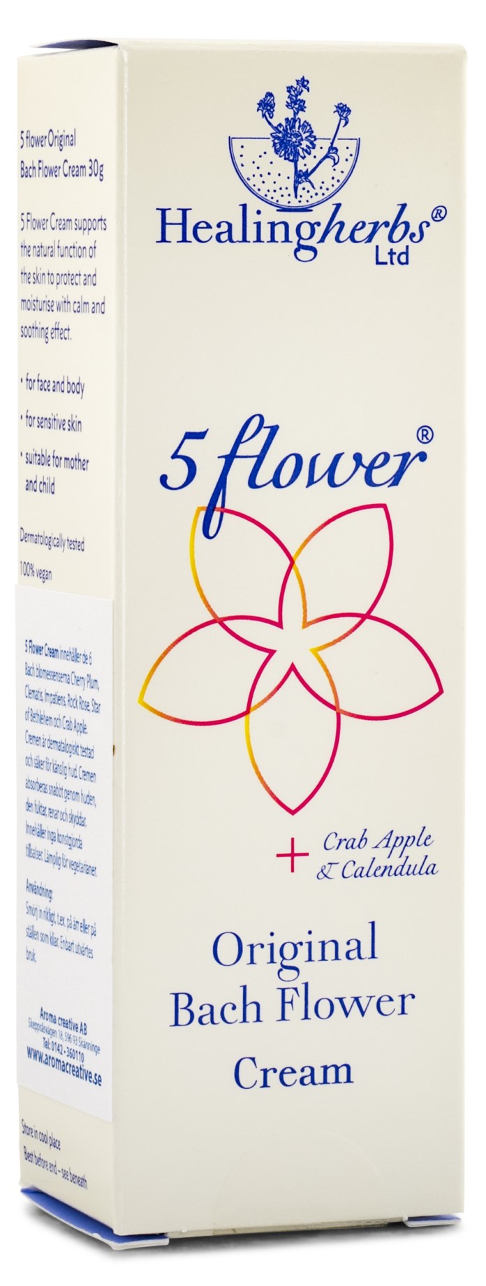 5 flower Cream er en rensende universalcreme til forbrændinger, kløe og andre fysiske hudproblemer. Kan anvendes til insektbid og hudirritation og hjælper også med at hele ar. Perfekt om vinteren til at smøre på tørre læber og forkølelsessår. Cremen indeholder seks af de 38 Back blomsteressenser.