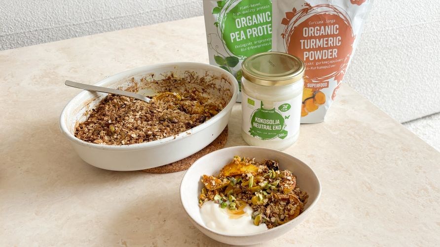Forvarm din ovn til 190°C. Enten dæk et ildfastfad med bagepapir, eller smør det let ind med kokosolie. Skær æblerne i tynde skiver og tilføj dem til fadet med et skvæt citronsaft, en god slat honing, kanel, kardemomme og gurkemeje. I en anden skål så bland havregryn, ærteprotein, honing, hakkede pistacienødder og lidt salt. Rør smeltet kokosolie i, indtil konsistensen bliver smuldrende. Hæld crumblen over æblerne, bag det derefter i 20-22 minutter, eller indtil crumblen er gylden og sprød på toppen. Lad det køle ned i 10 minutter før servering og nyd!