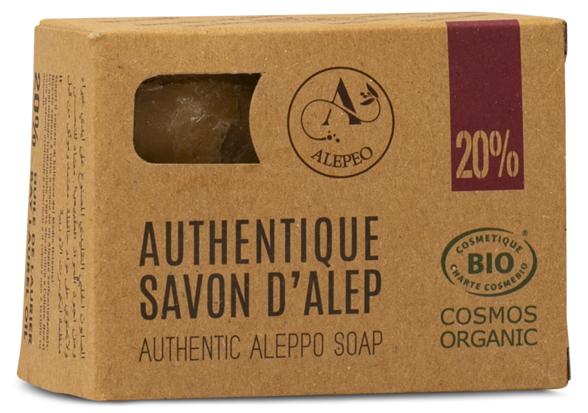 Alepposæbe 20% er en certificeret alepposæbe bestående af en økologisk base af mild olivenolie, der er kombineret med den plejende laurbærolie. To fine olier af højeste kvalitet, der skånsomt rengør ansigt, krop og hår. Alepposæbe kan også bruges til at fjerne pletter på tøjet, eller hvorfor ikke som en barbersæbe - en universalsæbe, helt enkelt! Alepposæben har en historie på flere tusinde år med oprindelse i byen Aleppo i Syrien, og selv i dag er sæben fremstillet efter de samme metoder, som dengang.