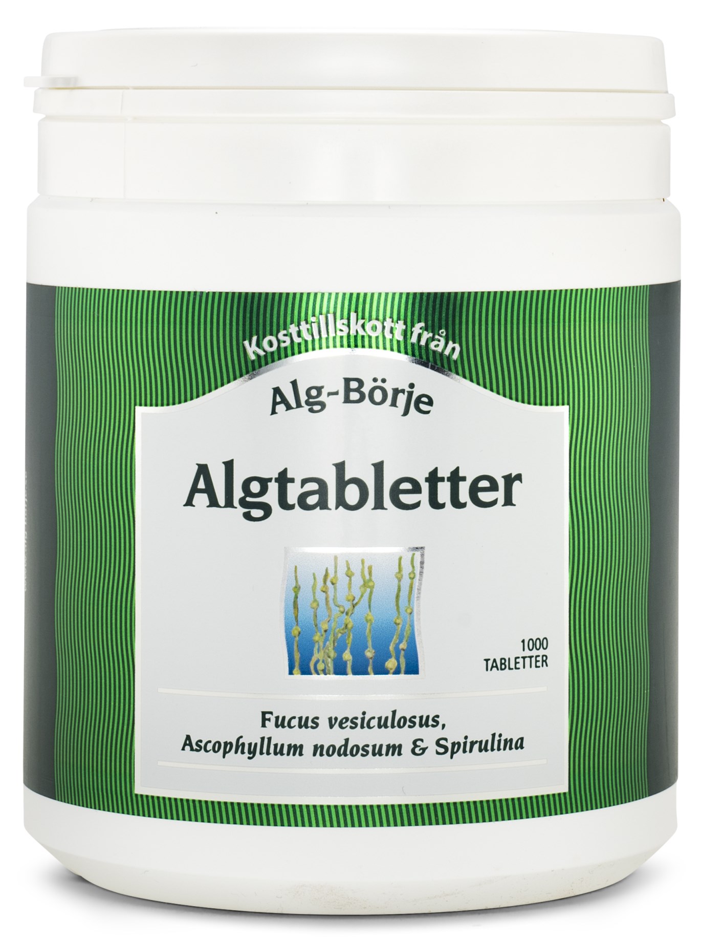 Alger er velkendte som næringrige sundhedsplanter, som er rige på sundt fedt, vitaminer og mineraler. Algetabletter fra Alg-Börje indeholder grisetang (Ascophyllum nodosum) og blæretang (Fucus vesiculosus) fra Islands kyst og er en praktisk måde at indtage algernes gavnlige næringsstoffer på. Grisetang og blæretang indeholder ikke kun rigelige mængder af nyttige fedtsyrer, vitaminer og mineraler, du finder også 19 forskellige aminosyrer og sporstoffer. Alg-Börje Algetabletter indeholder også spirulina, som er en næringsrig alge med et indhold af B12 og jern.