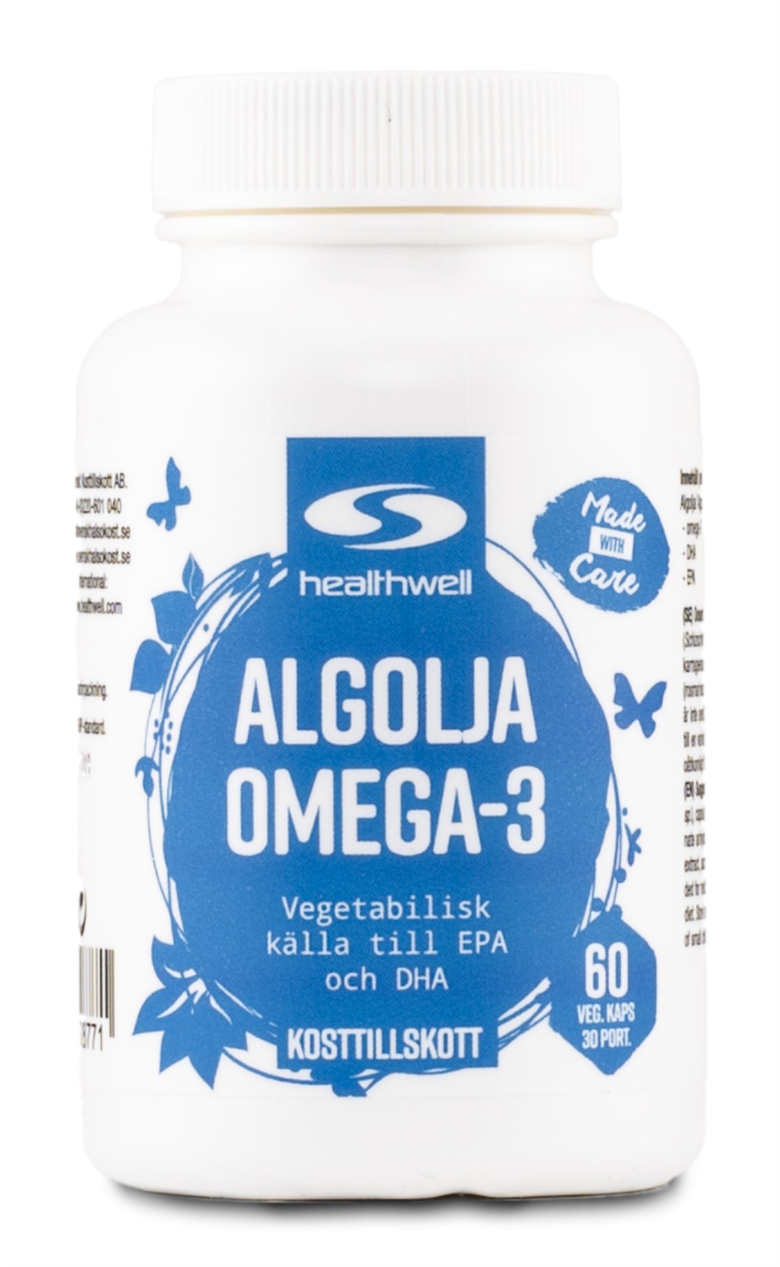 Healthwell Algeolie Omega-3 er et vegansk kosttilskud med omega-3 fra algen Schizochytrium sp. Den udvundne algeolie er naturligt rig på DHA og EPA, to omega-3 fedtsyrer, der har mange vigtige funktioner i vores krop. DHA hjælper med at opretholde normal hjernefunktion og syn, mens DHA og EPA bidrager til hjertets normale funktion. Derudover dyrkes algerne i et velkontrolleret miljø og er helt fri for giftstoffer og forurenende stoffer. Healthwell Algeolie Omega-3 er perfekt til dig, der leder efter en god, vegetabilsk kilde til omega-3!
