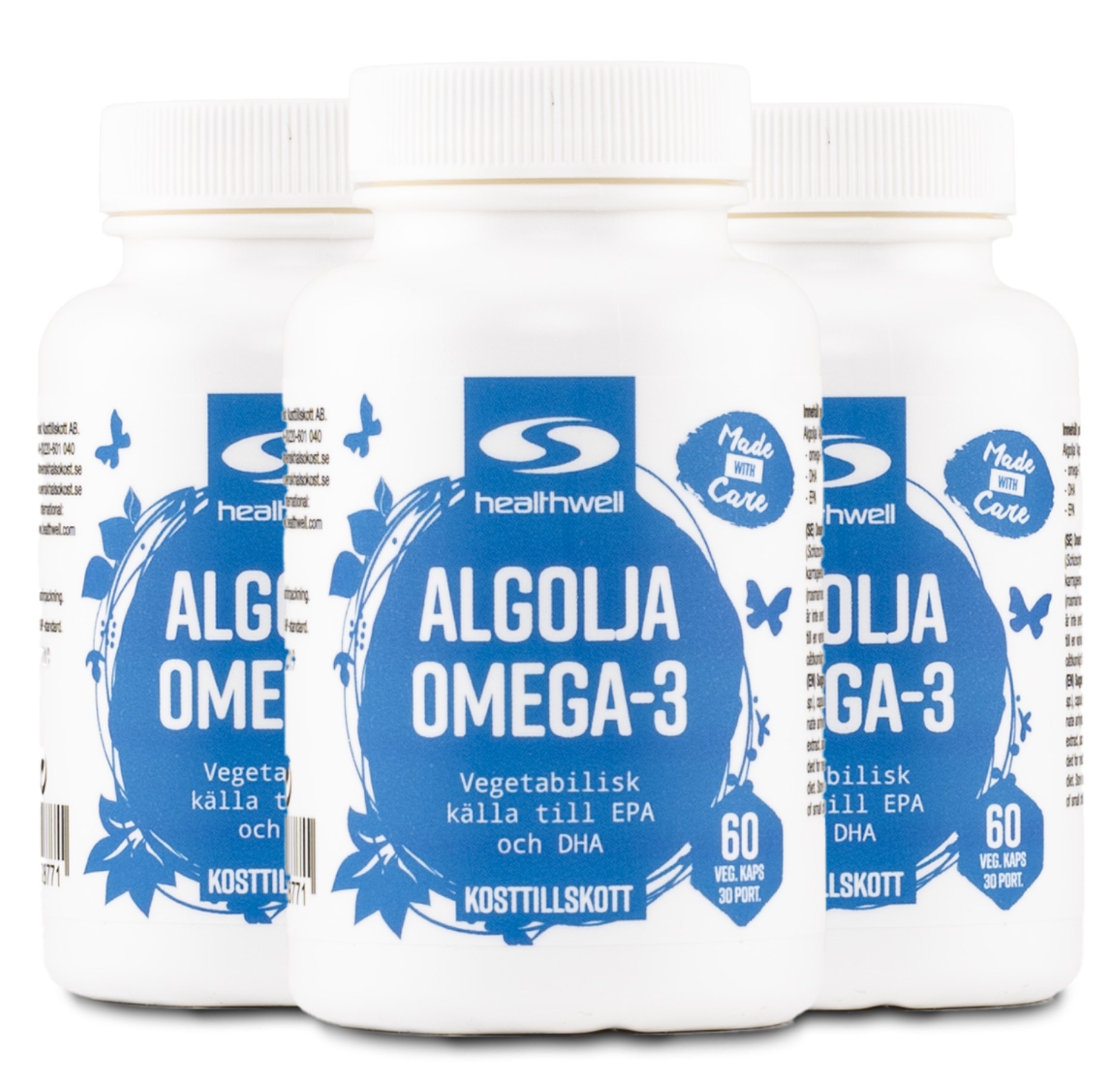Healthwell Algeolie Omega-3 er et vegansk kosttilskud med omega-3 fra algen Schizochytrium sp. Den udvundne algeolie er naturligt rig på DHA og EPA, to omega-3 fedtsyrer, der har mange vigtige funktioner i vores krop. DHA hjælper med at opretholde normal hjernefunktion og syn, mens DHA og EPA bidrager til hjertets normale funktion. Derudover dyrkes algerne i et velkontrolleret miljø og er helt fri for giftstoffer og forurenende stoffer. Healthwell Algeolie Omega-3 er perfekt til dig, der leder efter en god, vegetabilsk kilde til omega-3!