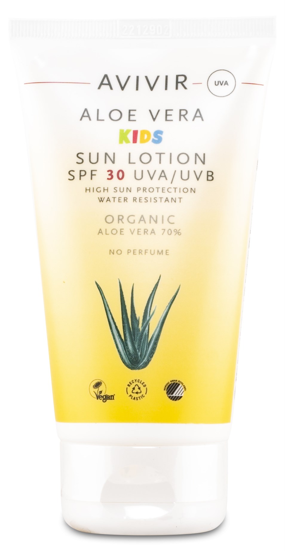 Avivir Aloe Vera Kids Sun Safe 30 er en uparfumeret og vandfast solcreme med en høj beskyttelsesfaktor, specielt for børn. Solcremen indeholder plejende olier og Bio-Aktiv Aloe Vera, som har en genopbyggende effekt på huden og styrker hudens eget forsvar. Den indeholder også E-vitamin, der har en fugtgivende og blødgørende effekt på huden.
