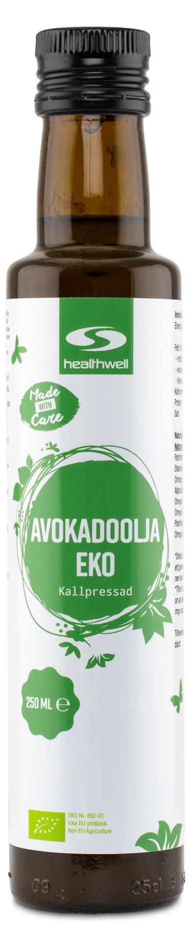 Healthwell Avocadoolie EKO kommer fra avokadoer (Persea gratissima), der er dyrket under økologiske forhold i Kenya. Avocadoerne bliver koldpresset ved lave temperaturer for at bevare alle næringsstoffer og egenskaber i slutproduktet. Healthwell Avocadoolie EKO kommer i en mørk glasflaske, hvilket bidrager til holdbarheden og modvirker harskning.