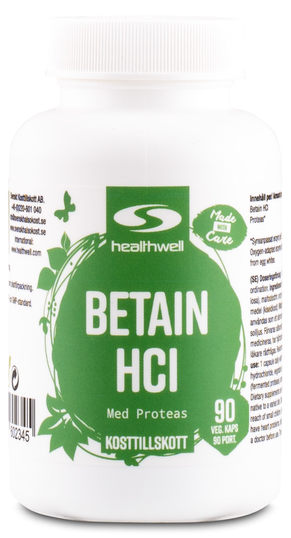 Betainhydrochlorid (Betain HCL) er en forbindelse af aminosyren betain og hydrochlorid, et salt fra saltsyre, som gør mavesyren sur. Betainhydrochlorid støtter produktionen af saltsyre i mavesaften. Betain HCL fra Healthwell er også forstærket med protease, et syreresistent enzym (pH 2,5-3,5), som hjælper ved spaltning af proteiner i mavesækken. En kapsel indeholder 60 mg protease, som kløver 128 g koaguleret protein fra æggehvide.