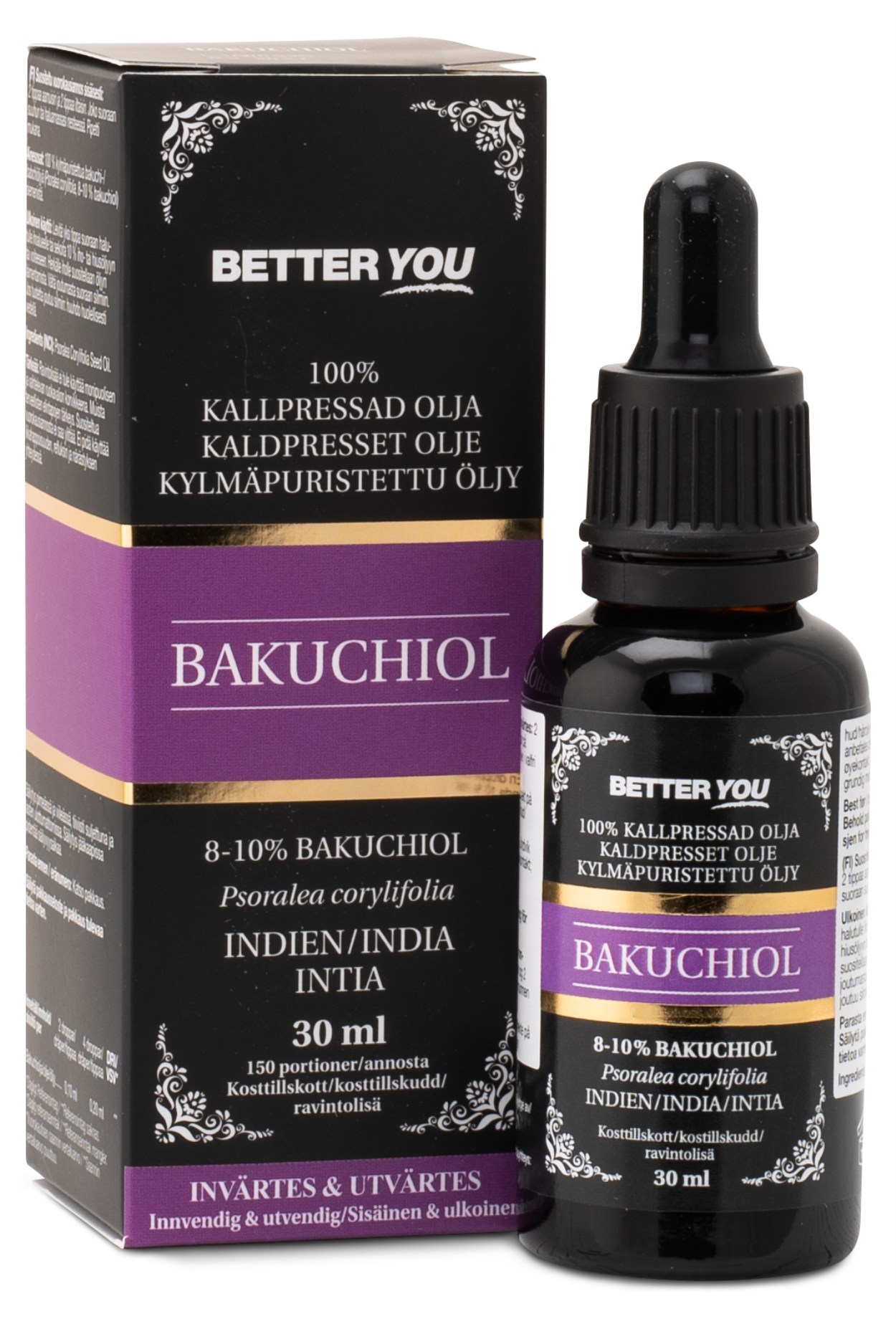 Better You Bakuchiol Koldpresset er en plantebaseret olie til hår og hud. Bakuchiol ligner retinol i sine egenskaber, men er et mildere alternativ, der er fremragende til den følsomme hud. Bakuchiol indeholder flere gode stoffer, herunder flavonoider og psoralener. Flavonoider anses for at have antioxidante og antiinflammatoriske egenskaber, mens psoralener kan hjælpe med at gøre pigmentpletter mindre synlige. Bakuchiol kan reducere fine linjer og rynker, samtidig med at det kan påvirke kollagenproduktionen og forbedre hudens glød og struktur. Derudover bidrager omega-3 og -9 med fugtgivende fedtsyrer, både indefra og udefra. Udover som hudpleje er bakuchiol også værdsat som hårolie, både i hovedbunden og i længderne.