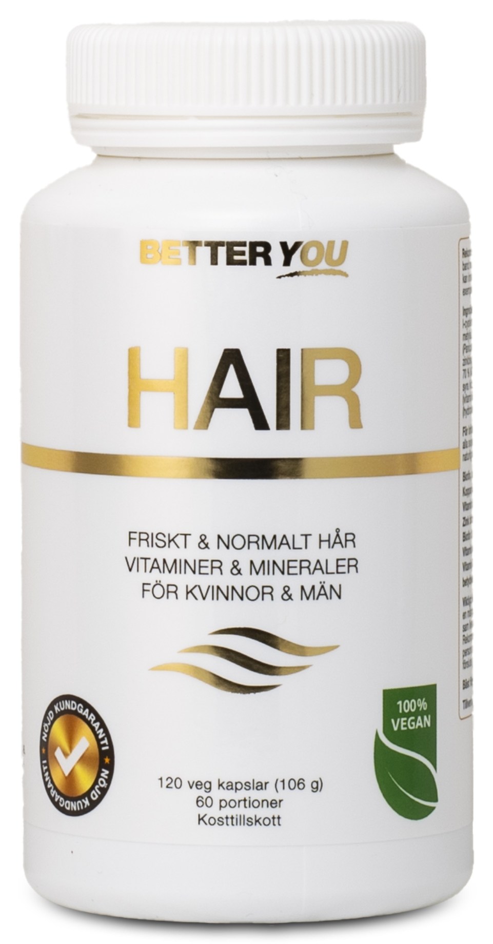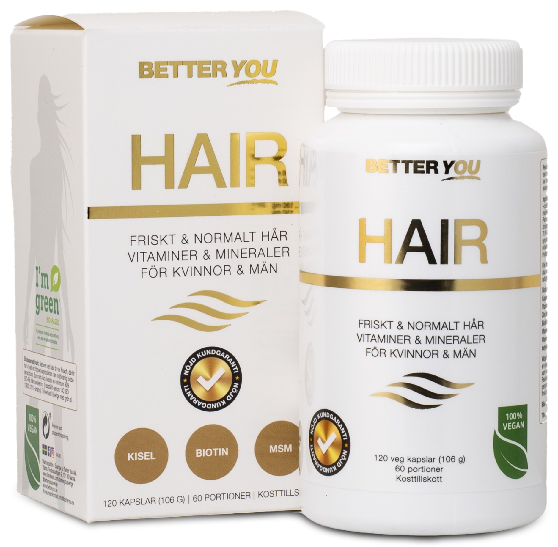 Better You HAIR er et eksklusivt kosttilskud, der hjælper håret med at forblive sundt og stærkt. Tilskuddet indeholder udvalgte vitaminer, mineraler og aminosyrer, som på forskellig måde bidrager til normalt hår og hovedbund. Tilskuddet indeholder blandt andet biotin, zink og selen, som bidrager til at opretholde normalt hår, samt kobber, som bidrager til hårets normale pigmentering. Det indeholder også naturligt svovl i form af MSM samt aminosyren L-cystein, som begge er naturlige komponenter i håret. Desuden indeholder Better You HAIR fuldnæringsekstrakt fra bambus, der er naturligt rig på silicium. Silicium bidrager til dannelsen af kollagen, som er en vigtig byggesten i hår, hud og negle.
