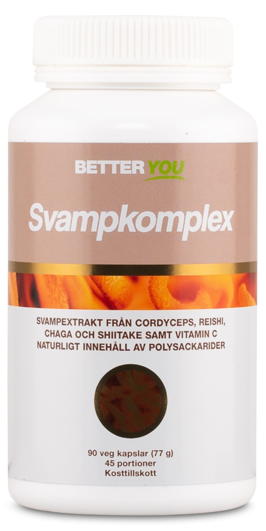 Better You Svampekompleks er et kompleks bestående af svampene cordyceps, reishi, chaga og shiitake, fire populære svampe, som er velkendte inden for naturlægemidler. Komplekset indeholder også C-vitamin, som bidrager til immunsystemets normale funktion. Svampene er naturlige adaptogener og har en høj ORAC-værdi, hvilket er en værdi for, hvor mange antioxidanter en fødevare indeholder. Adaptogener er planter, som indeholder stoffer, der hjælper kroppen med at tilpasse sig udfordrende forhold og modvirke skader forårsaget af disse belastninger.