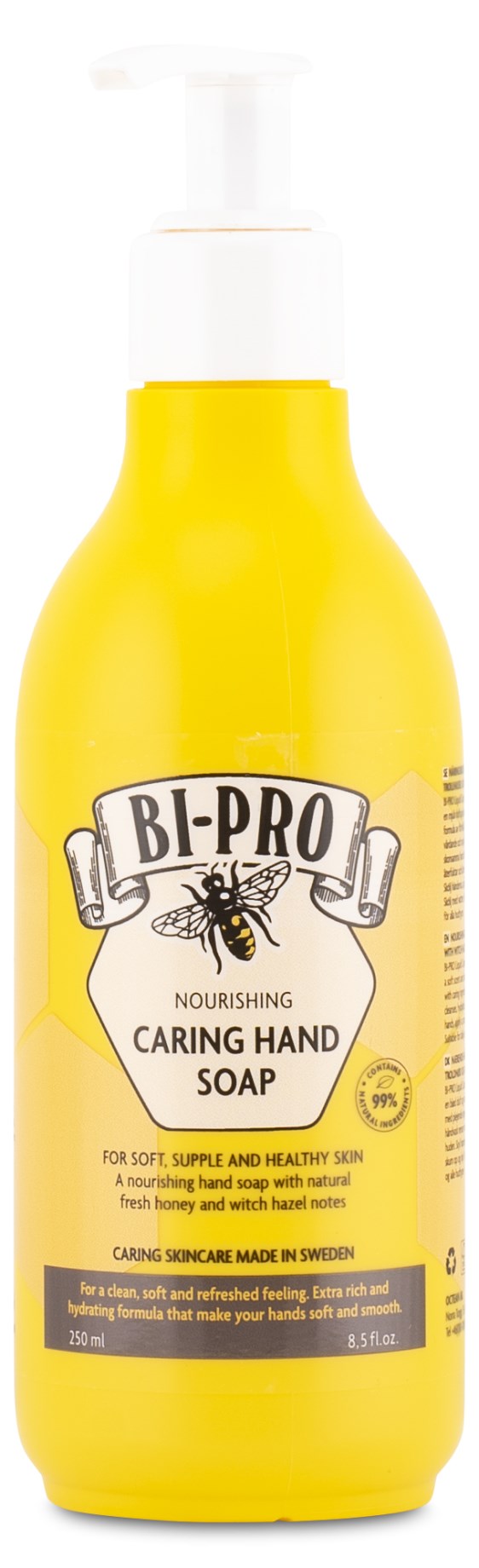 Bi-Pro Nourishing Caring Hand Soap er en nærende og plejende håndsæbe med naturlige ingredienser, der effektivt men skånsomt renser hænderne og efterlader huden fugtet og blød. Sæben kombinerer forsæbet olivenolie med honningekstrakt, glycerin og troldhasselvand for at nære huden og mindske irritation.