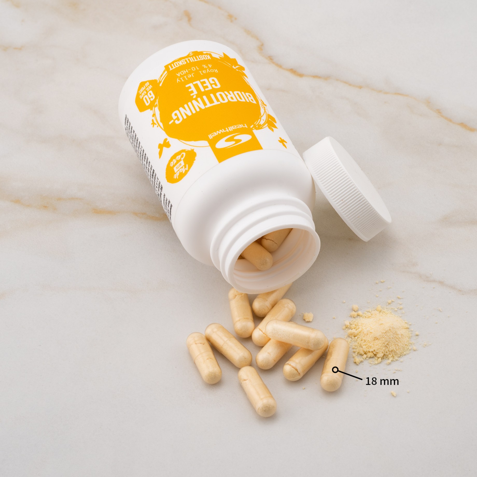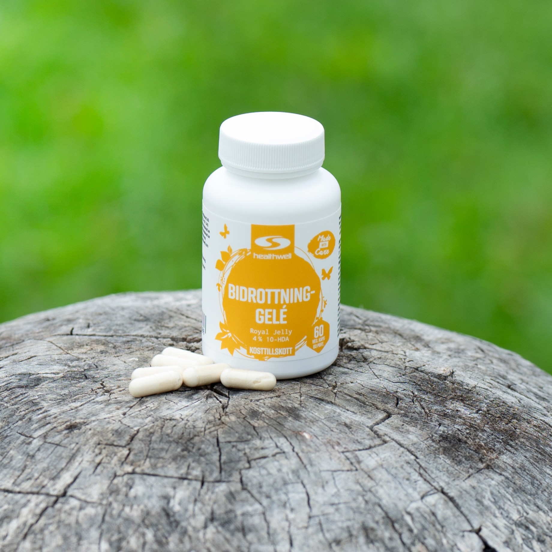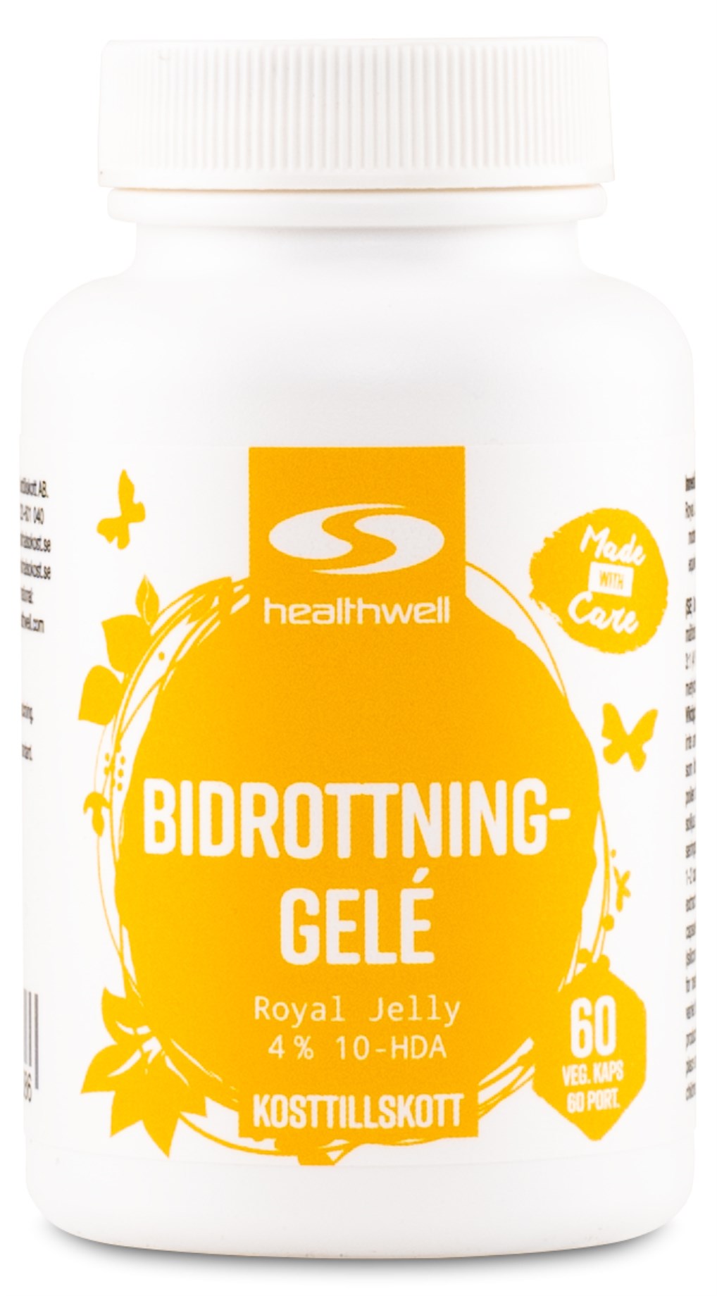 Healthwell Bidronninggele Royal Jelly indeholder naturligt ekstrakt af det spændende stof bidronninggele fra bikuber. Produktet indeholder 4 % af stoffet 10-DHA, som anses for at være den aktive ingrediens. Bidronninggele er et omtalt stof, som blandt andet er studeret for sin påvirkning på hormonbalance under overgangsalder og PMS, fertilitet samt kvalitet af hår, hud og negle. Anbefalet dosering er 1-2 kapsler om dagen.