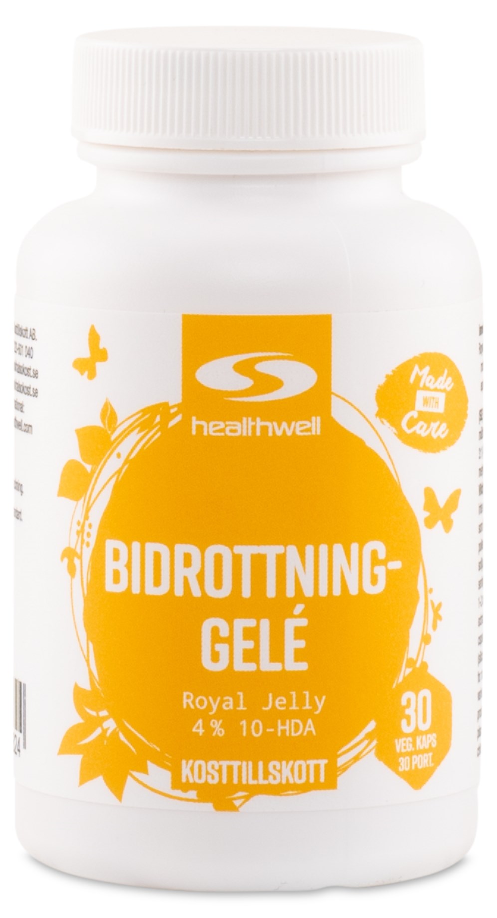 Healthwell Bidronninggele Royal Jelly indeholder naturligt ekstrakt af det spændende stof bidronninggele fra bikuber. Produktet indeholder 4 % af stoffet 10-DHA, som anses for at være den aktive ingrediens. Bidronninggele er et omtalt stof, som blandt andet er studeret for sin påvirkning på hormonbalance under overgangsalder og PMS, fertilitet samt kvalitet af hår, hud og negle. Anbefalet dosering er 1-2 kapsler om dagen.