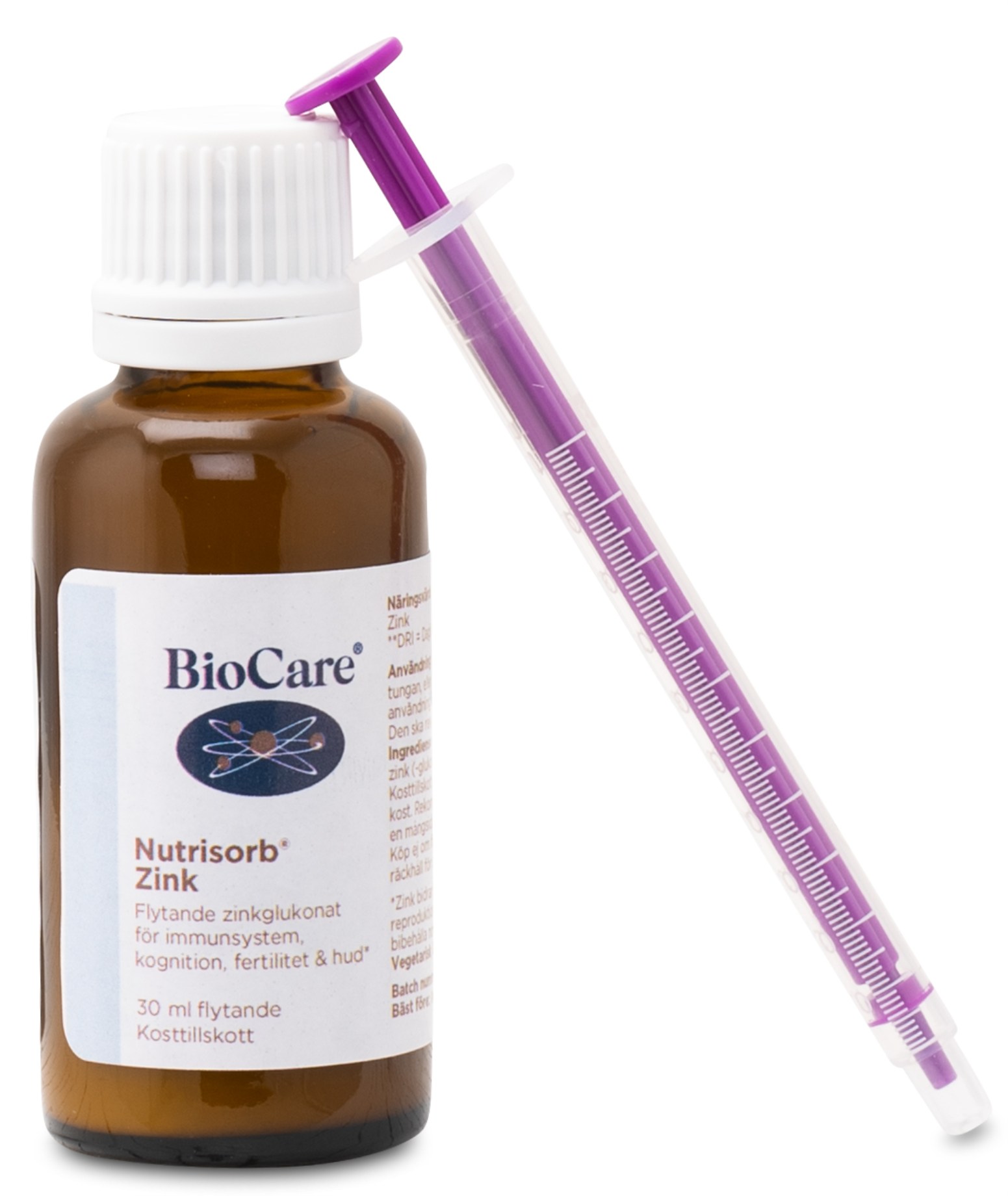 Nutrisorb Zink fra BioCare er et flydende zinktilskud i en vandbase, der nemt kan blandes i væske eller lægges under tungen. Væsken er hvid og har en sirupsagtig konsistens. Selvom konsistensen er tykkere, er den tilstrækkelig tynd til let at blive doseret med den medfølgende sprøjte og kan anvendes direkte under tungen eller blandes i væsker. Zink bidrager blandt andet til at opretholde et normalt immunforsvar, normal DNA-syntese og normal fertilitet. Nutrisorb Zink indeholder ingen unødvendige tilsætningsstoffer!