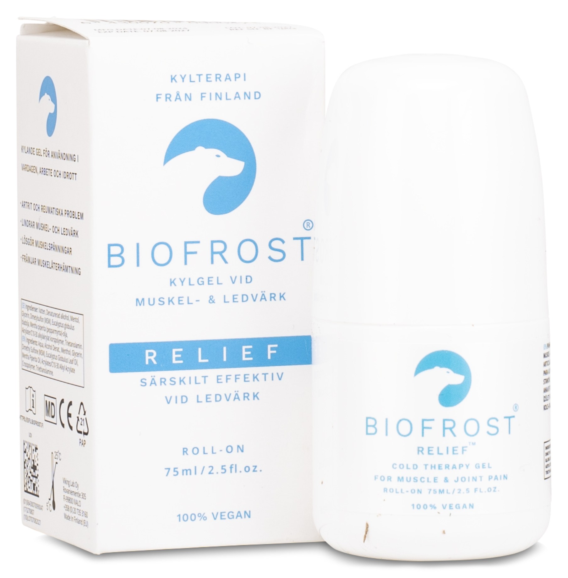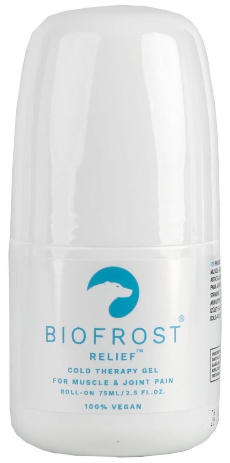 Biofrost Relief Roll On er en hurtigvirkende, effektiv kølebehandling til muskel- og ledsmerter forårsaget af sport, kontorarbejde og daglige belastninger. Biofrost Relief Roll On giver lindring ved gigt, rygsmerter, muskelstivhed, muskelsmerter, stive led og kroniske smerter. Den virker ved gradvist at sænke hudens temperatur – inden for cirka et minut sænkes temperaturen på det valgte hudområde, for derefter at fortsætte med at falde gradvist med en total nedkøling på op til omkring 7 grader efter cirka 25 minutter. Effekten varer derefter i op til nogle timer. Fremragende til smerter i nakke, skuldre og nedre ryg, ved forstuvninger, forstrækninger, blå mærker samt ved nervesmerter, reumatiske smerter og hovedpine, og til at give restitution efter fysisk træning.