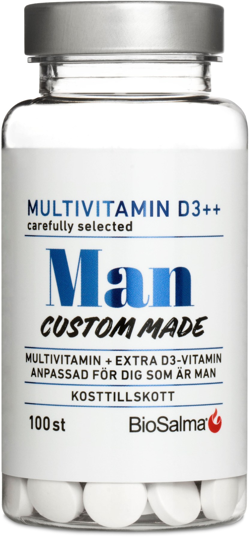 BioSalma Multivitamin Mand D3-vitamin++ er et komplet multivitamin, der er særligt sammensat til mænd. Med et bredt spektrum af vitaminer og mineraler er det let at få sin daglige dosis. Ekstra D-vitamin gør tilskuddet ekstra relevant for os i Norden. Tag 1-2 tabletter dagligt for at sikre dit indtag.