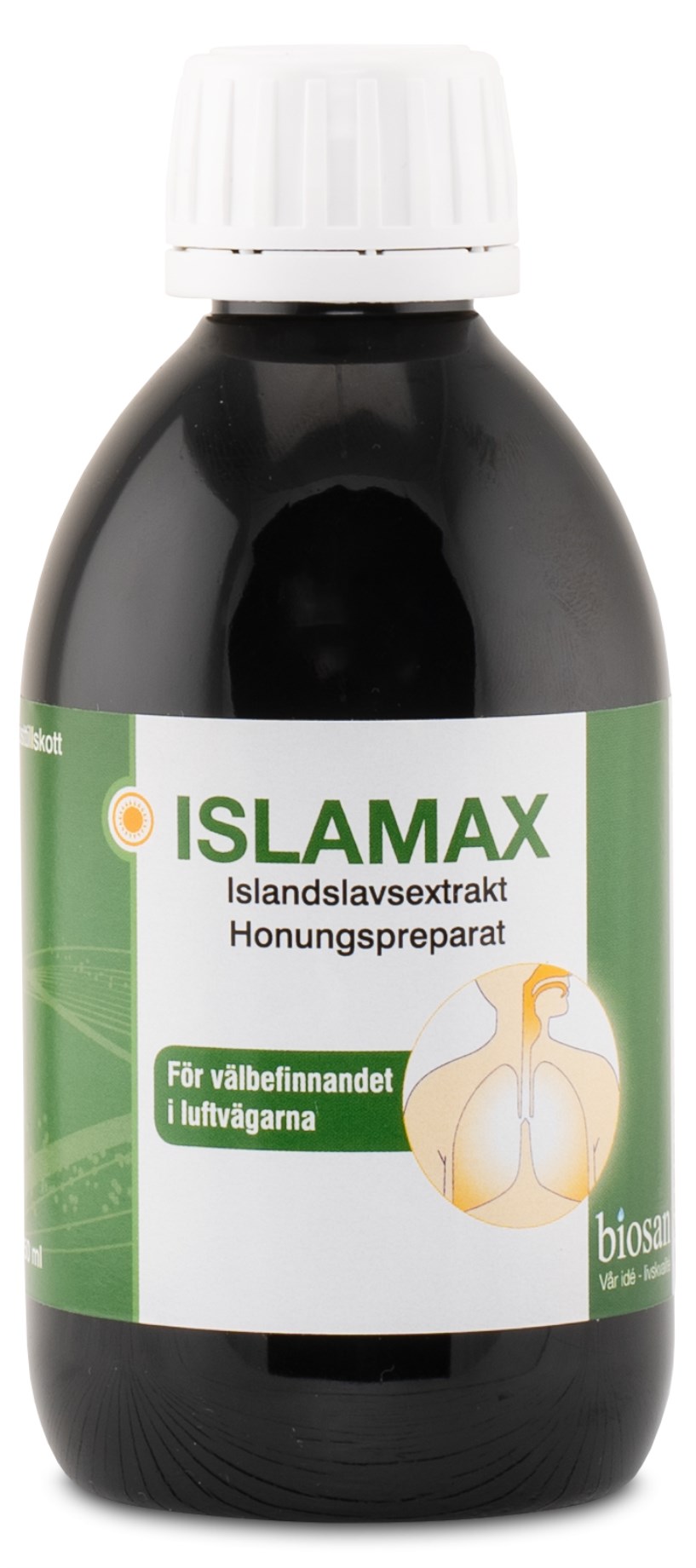 Biosan Islamax er et velsmagende og naturligt honningpræparat, der indeholder ekstrakt af islandsk mos, agerpadderok, timian og anisfrø. Disse ingredienser er traditionelt blevet brugt til at virke slimløsende. Biosan Islamax indeholder organiske forbindelser, enzymer, mineraler og vitaminer.