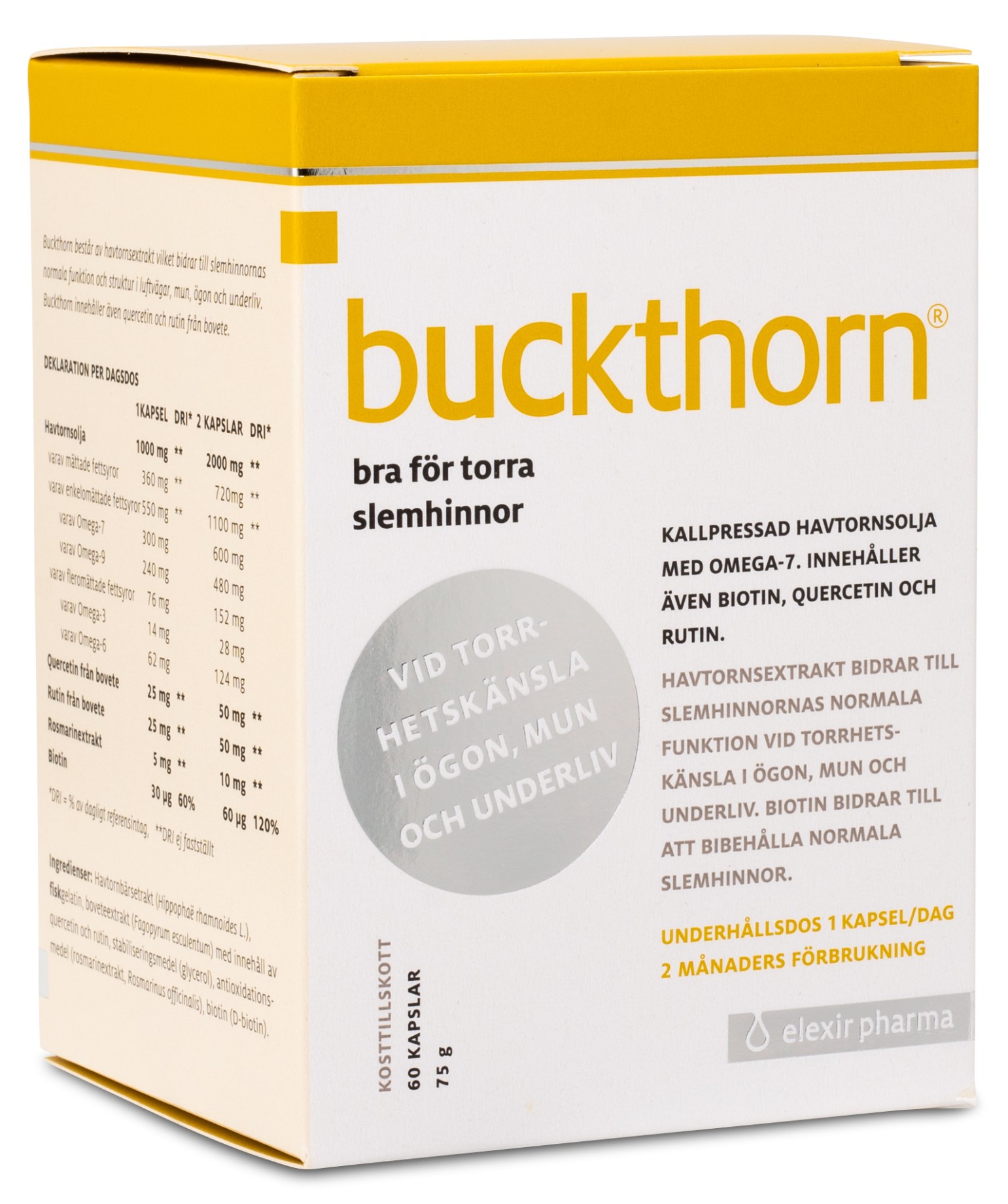 Buckthorn koldpresset havtorneolie er rig på omega-fedtsyrer og indeholder også biotin, quercetin og rutin. Havtorn indeholder næringsstoffer som bidrager til slimhindernes normale funktion og modvirker tørre øjne, mund og luftvej. Havtornekstrakt er også en naturlig kilde til de flerumættede fedtsyrer, omega-3 og -6, samt de enkeltumættede fedtsyrer, omega-7 og -9.