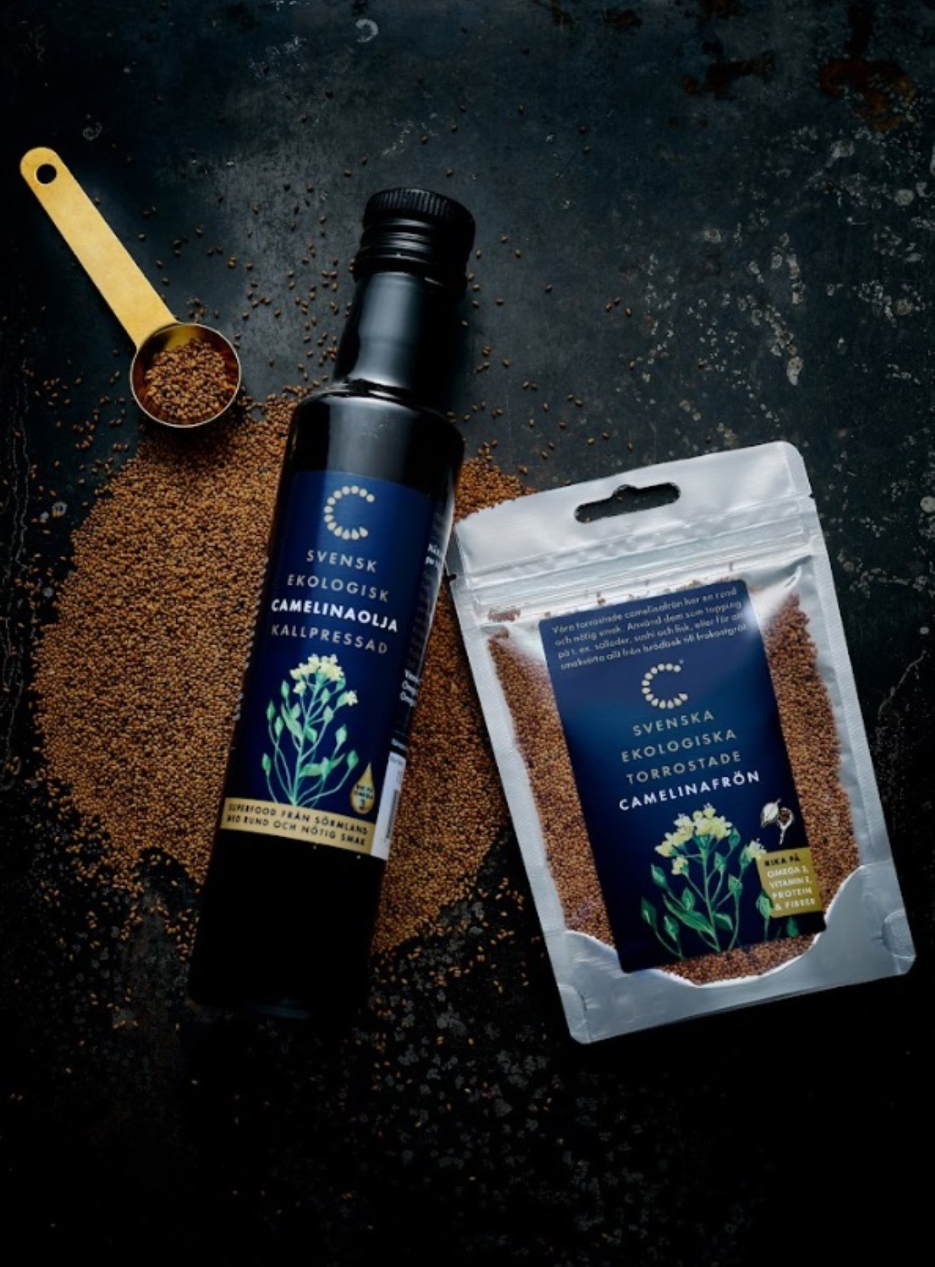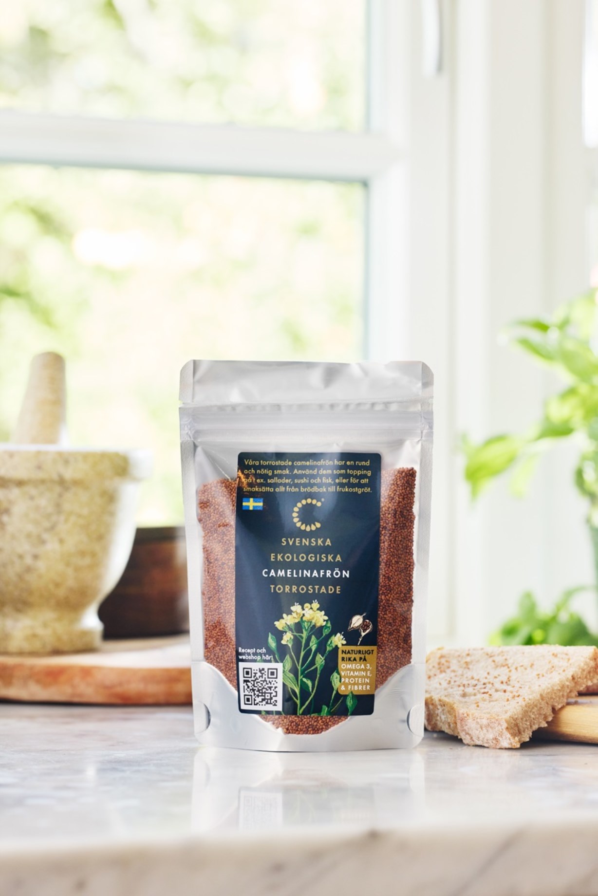 Camelinafrø Krav Tørristede fra Camelina er tørristede camelinafrø - næringsrige, små og terrakottabrune med en nøddeagtig smag og en herligt sprød tekstur. KRAV-certificerede og nænsomt tørristede på en familiegård i Sörmland - fremstillet med omhu for både din sundhed og miljøet. De indeholder sunde fedtsyrer og er desuden naturligt rige på protein og fiber. Et fremragende alternativ til chia-, sesam- og valmuefrø eller nødder. Camelinafrø er alsidige og kan bruges i køkkenet til at drysse over salat, sushi, fisk eller som smagsgiver i brødbagning og grød.