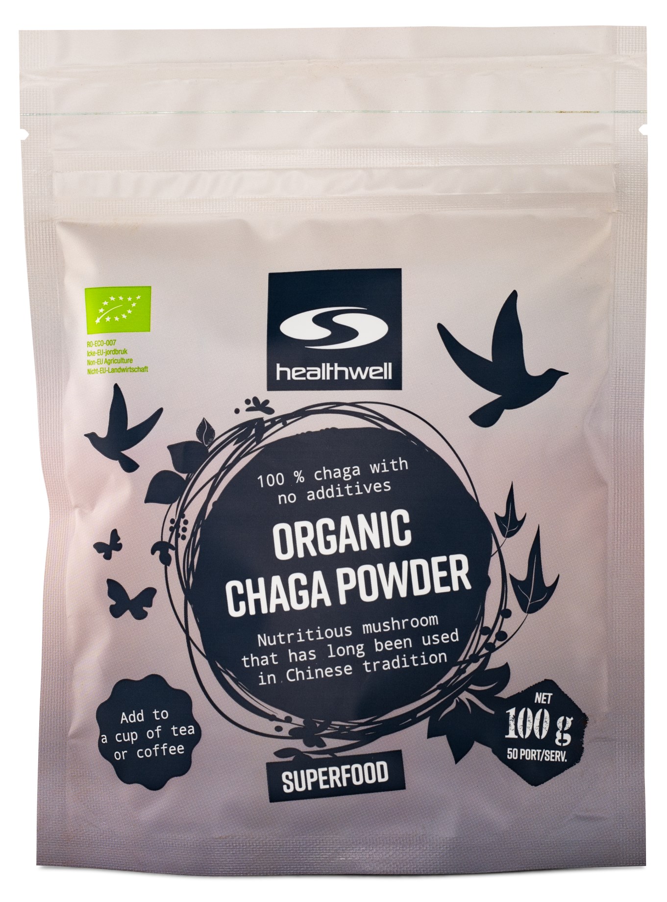 Healthwell Chaga EKO er et pulver med mild smag fra svampen chaga (Inonotus obliquus), også kaldet birke-spejlsporesvamp på dansk. Chaga har en meget høj ORAC-værdi (antioxidanter) samt mineraler og vitaminer. Du kan nemt blande chagapulveret i en varm drik og drikke det som te.