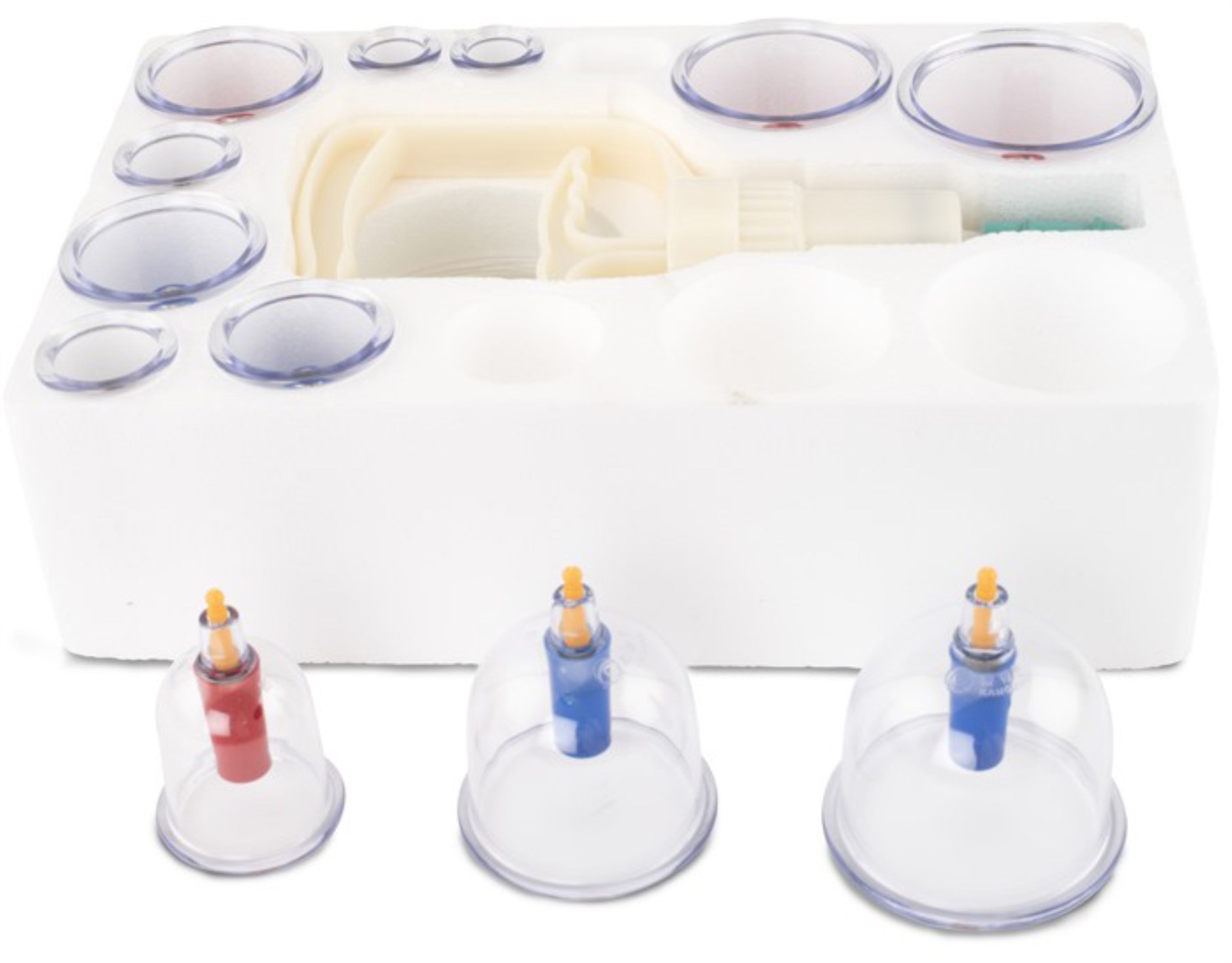 Pakken indeholder 12 sugekopper i forskellige størrelser, en pumpe og en forlængerledning. En instruktionsbog (på engelsk og kinesisk) medfølger.
