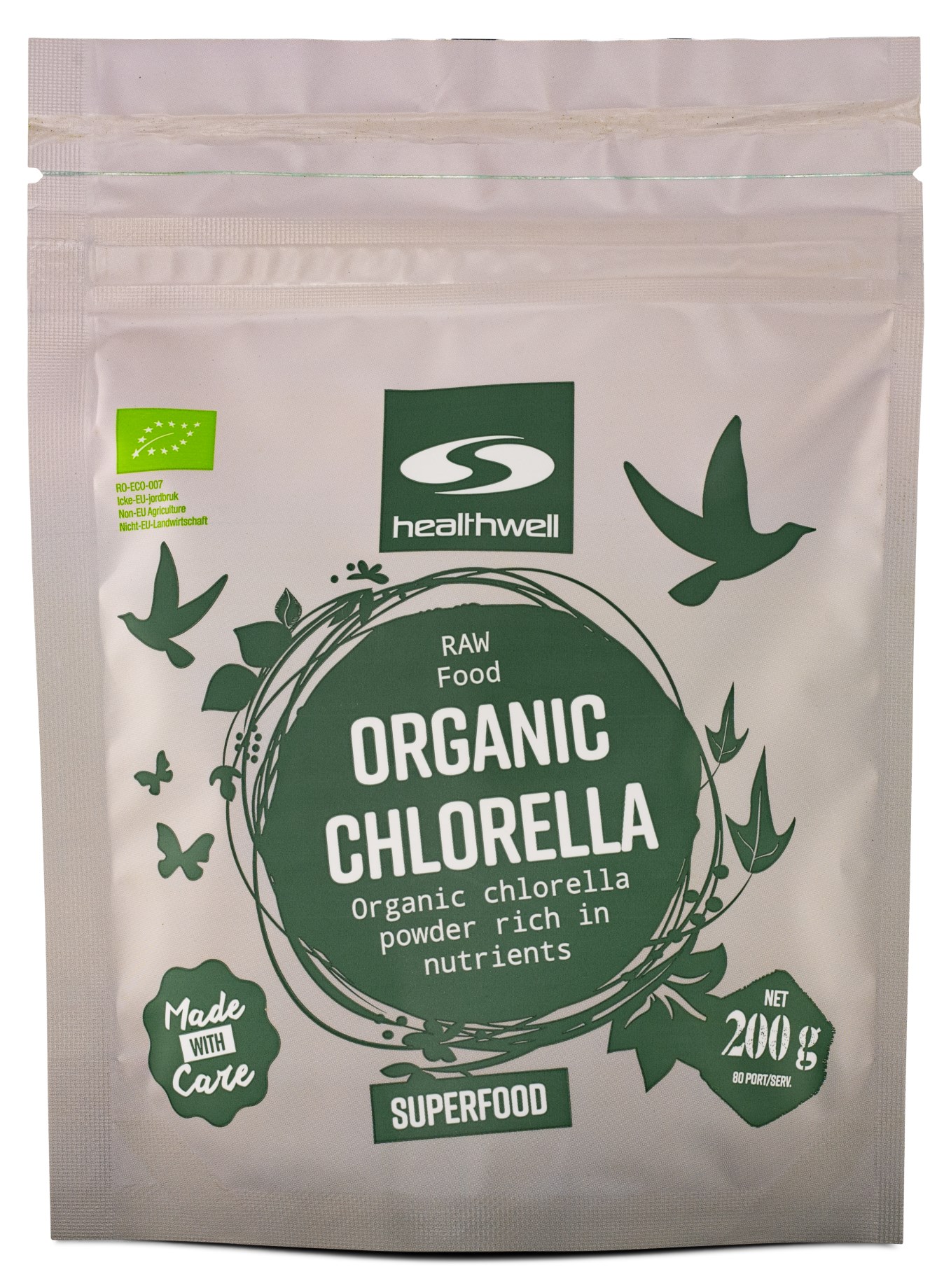 Healthwells Chlorella EKO er helt økologisk og dyrkes skånsomt i ferskvandsdamme, hvor den derefter høstes, tørres og males ned til et næringsrigt pulver. Takket være den skånsomme dyrkning har den bevaret alle vigtige næringsstoffer og antioxidanter. Chlorella EKO betragtes som raw food. Raw food betyder, at det under fremstillingsprocessen forsigtigt højst opvarmes til 42 grader for at bevare alle næringsstoffer.