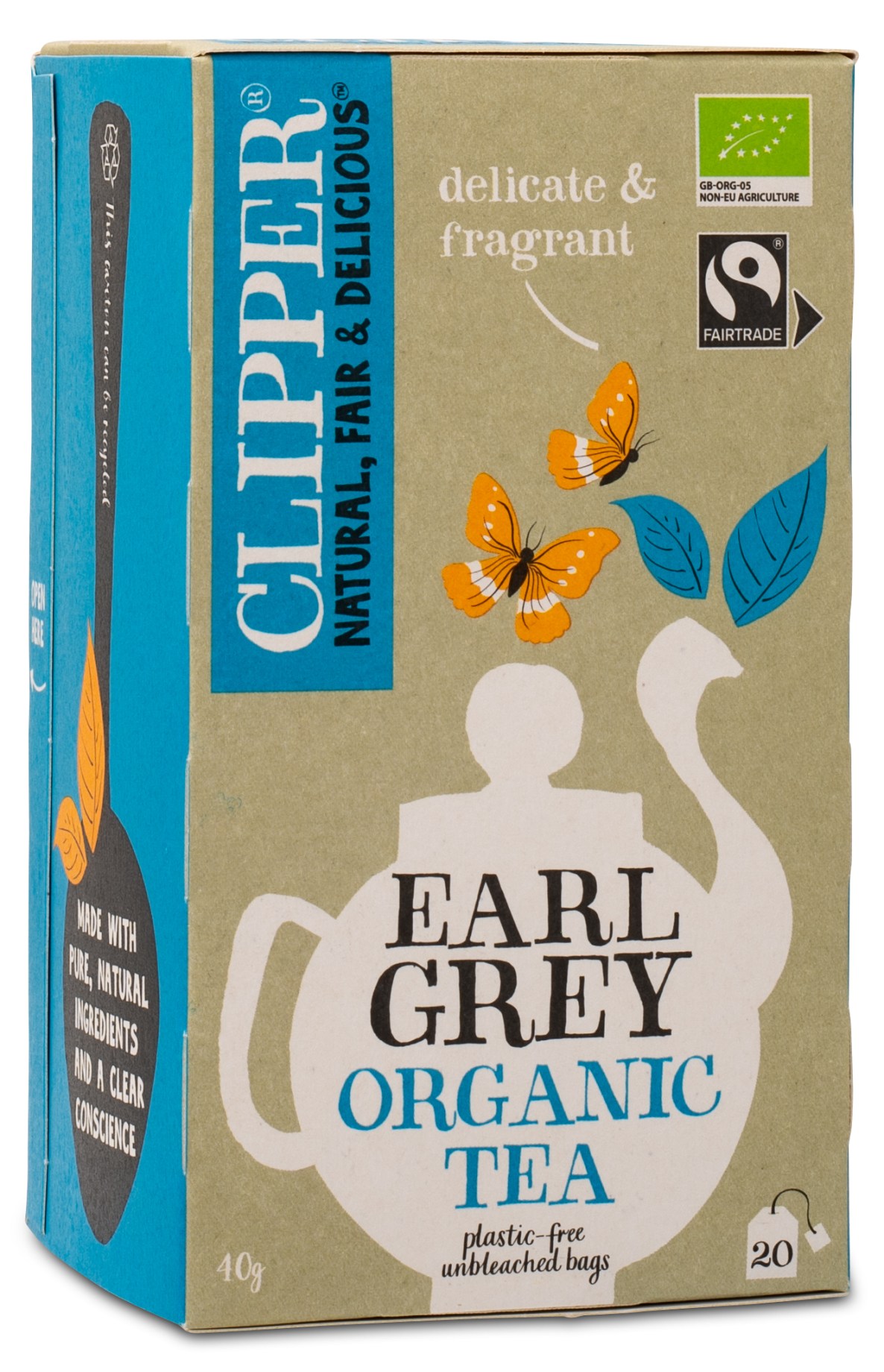 Clipper Tea Earl Grey er en økologisk sort te med en klar, frisk smag af bergamot. Teen er Fairtrade-mærket, så du kan nyde en kop med god samvittighed, og råvarerne er desuden økologiske. Sort te får sin karakteristiske sorte farve, når bladene først skæres eller knuses og derefter oxideres, så de mister deres naturlige grønne farve, for til sidst at tørres og pakkes. Jo finere knust en sort te er, desto kortere tid behøver den at trække i varmt vand for at give smag.