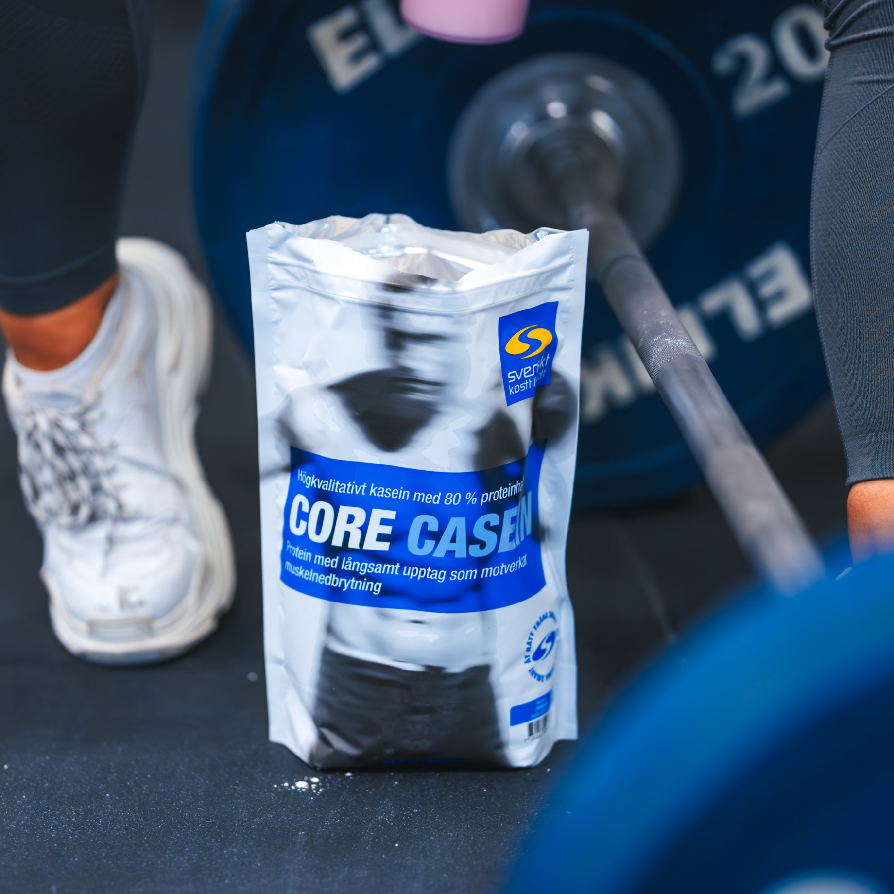Core Casein passer lige så godt om morgenen til havregrøden, til mellemmåltidet med lidt bær, som til aftenen. Kasein er dog primært blevet forbundet med at være et natteprotein takket være den langsomme udskillelse af protein. Det er, når vi sover, at den meste restitution og opbygning sker. At spise kasein, før du går i seng, betyder, at proteinet optages om natten, mens du sover, og leverer byggesten til musklerne. Det hjælper med at modvirke nedbrydningen af eksisterende muskelmasse og fremmer også opbygningen af ny muskelmasse. Du, der ønsker at tabe dig ved at reducere energiindtaget, kan drage fordel af kasein for både at modvirke muskelnedbrydningen men også for den høje mæthed, der varer længere.