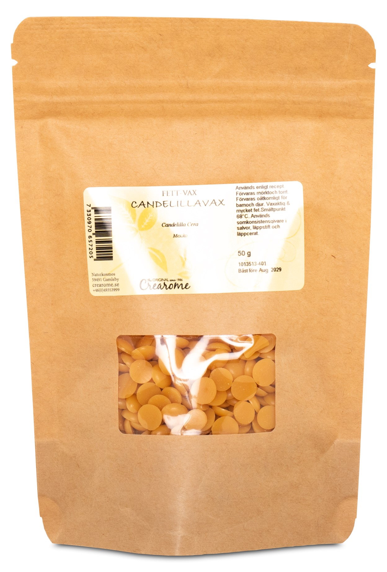Crearome Candelillavoks er en holdbar og vegetabilsk voks. Voksen udvindes fra stammen af Candelillabusken, hvor den også får sin gule farve fra. Voksen bruges primært som en konsistensgiver i salver, læbestifter og læbepomader, men den kan også bruges til andre produkter, såsom skopuds. Crearome Candelillavoks er helt vegansk, har et smeltepunkt på 68°C og kommer i skiver af flager for at lette smelteprocessen. Brug voksen hjemme med din yndlingsolie – hvorfor ikke lave en blødgørende salve med lavendelens beroligende egenskaber og duft?