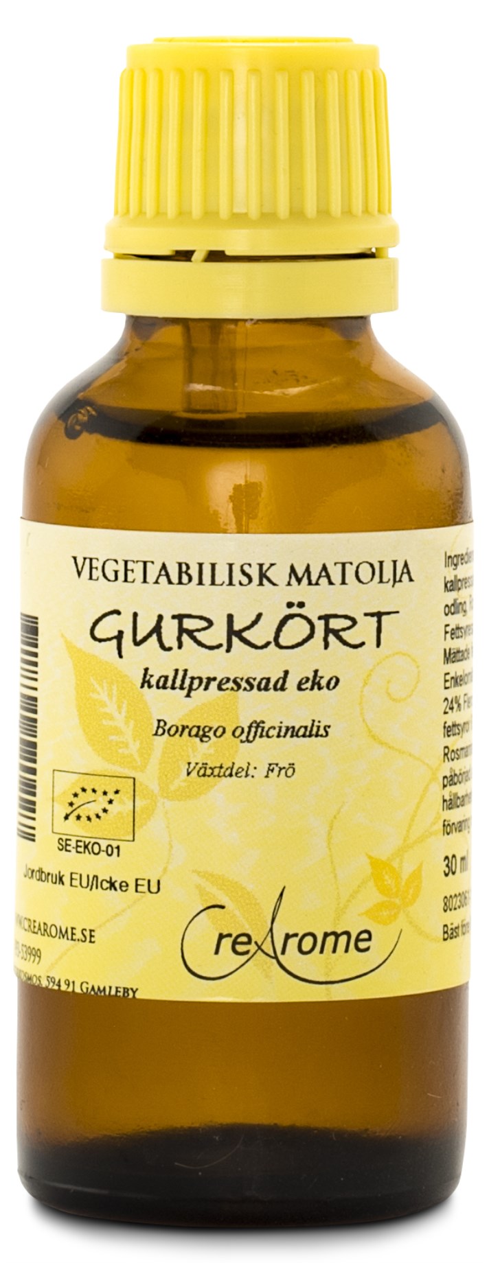 Crearomes Agurkurtolie ØKO er koldpresset og økologisk. Brug i en opløsning på 1 til 5% i hudplejeolie, eller anvend som madolie, når du ønsker et tilskud GLA.