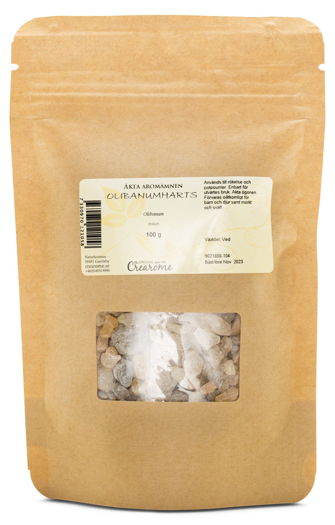Crearome Olibanumharz består af tørret planteudskillelse eller harpiks fra Boswelliatræet og bruges som røgelse på grund af dets unikke duft og spændende egenskaber. Duften er let krydret og træagtig, og røgelsen er et populært element i mange forskellige rituelle og ceremonielle sammenhænge, herunder inden for den katolske kirke. Harpiksen bruges sammen med en røgelsesholder, for eksempel i ler, hvor den antændes for at frigive de spændende dufte.