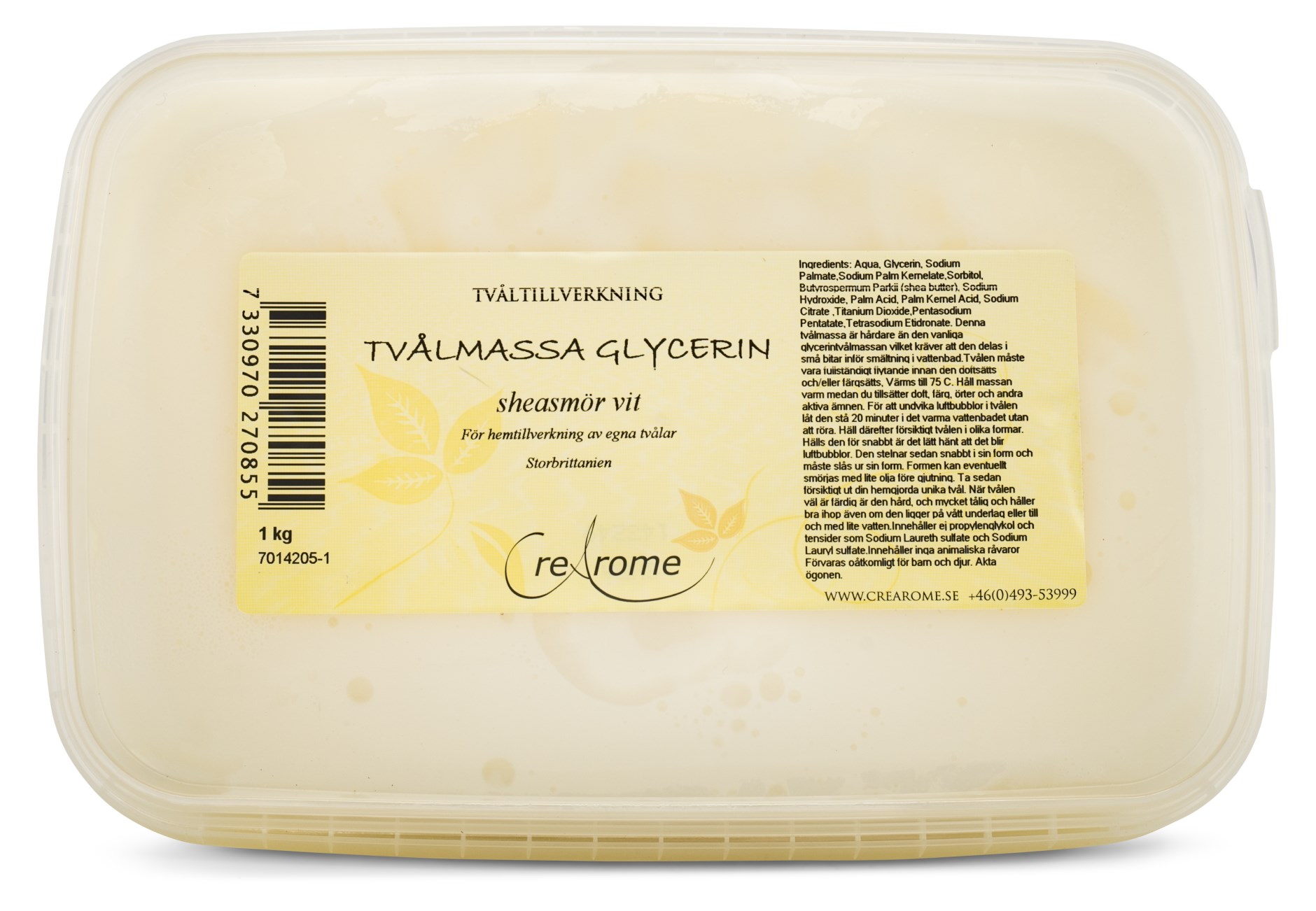 Crearome Sæbemasse Sheasmør er en færdig sæbemasse af glycerin med 7% tilsat sheasmør. Dette giver en ekstra cremet og fedtet følelse, hvilket betyder, at din færdige sæbe bliver mere plejende for huden. Lav din egen sæbe med den ønskede duft og farve ved at tilføje æteriske olier og sæbefarve. Crearome Sæbemasse Sheasmør kan bruges til både håndsæbe og kropssæbe og har en neutral, cremehvid farve.