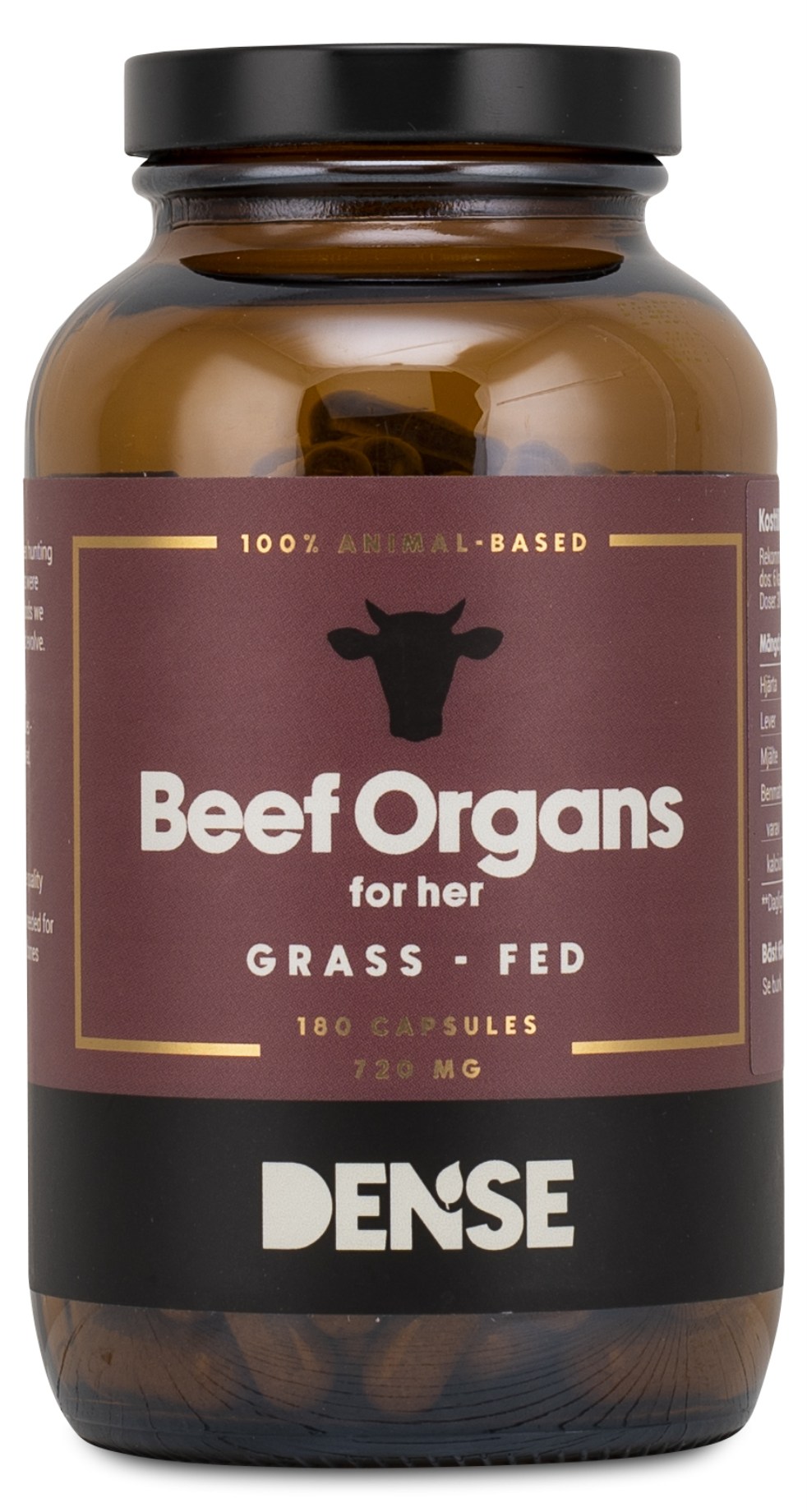 Dense Okseorgan for Her er et naturligt kosttilskud til kvinders behov. Med frysetørret organpulver fra græsfodrede kvæg: hjerte, lever, milt og knoglematrix. Hjerte og milt er to næringsrige ingredienser, der har en lang tradition i forskellige madkulturer. Lever er næringsrig og let for kroppen at optage med en bred sammensætning af vitaminer og mineraler. Knoglematrix indeholder en naturlig balance af calcium og fosfor sammen med sporstoffer. Kapslerne er skånsomt frysetørrede for at bevare råvarernes egenskaber og indeholder ingen tilsætningsstoffer eller kunstige ingredienser.