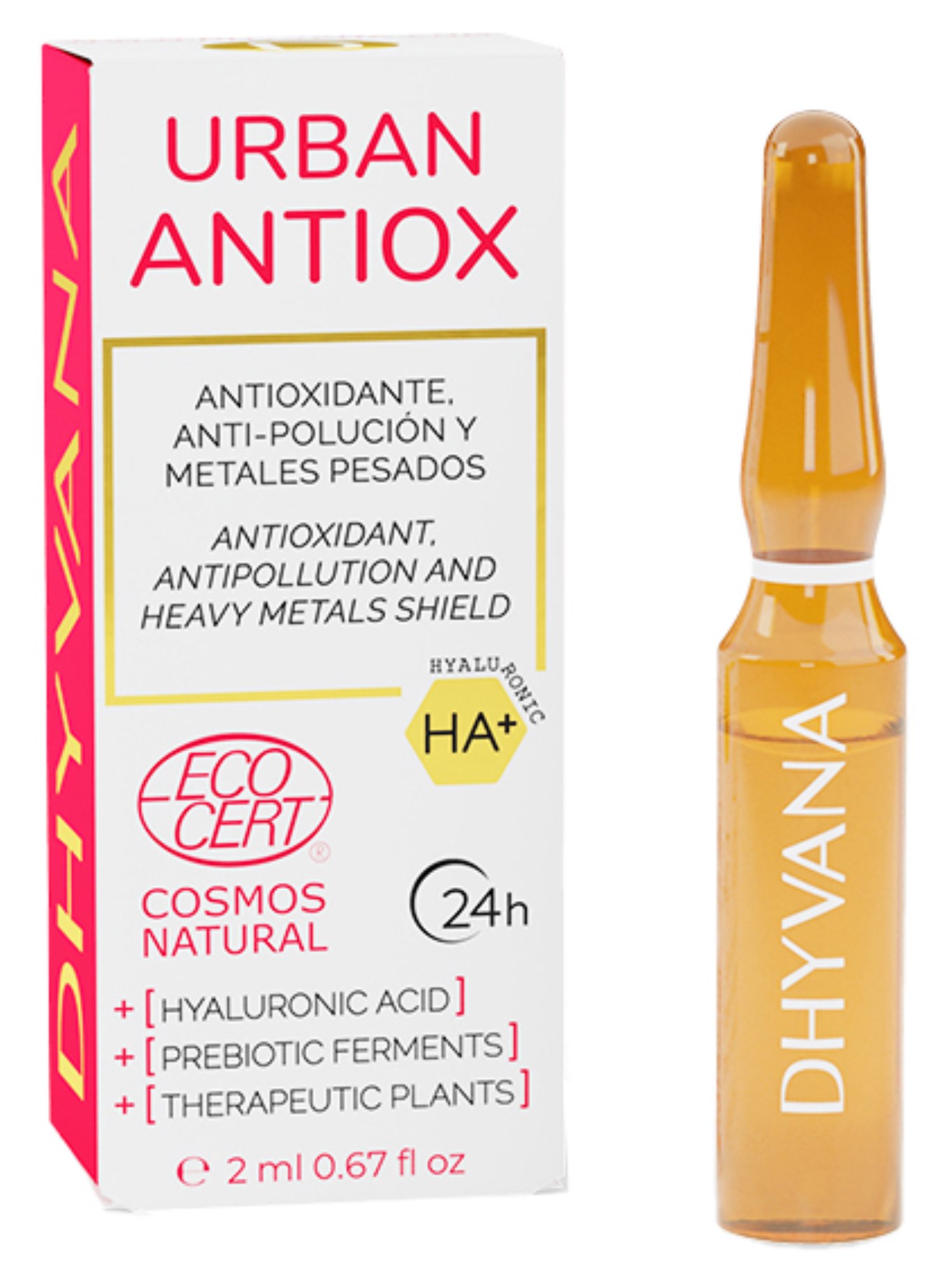 Dhyvana Ampuller URBAN ANTIOX er en hyaluronsyre ampul med antioxidante egenskaber - perfekt til dig med stresset og uren hud! Med piachia-præbiotika og nærende ekstrakter fra salatblade, drageblod, bacopa, moringa og lapsana. Ilter huden og beskytter mod urenheder. Brug som en intensiv behandling eller for et langsigtet resultat!