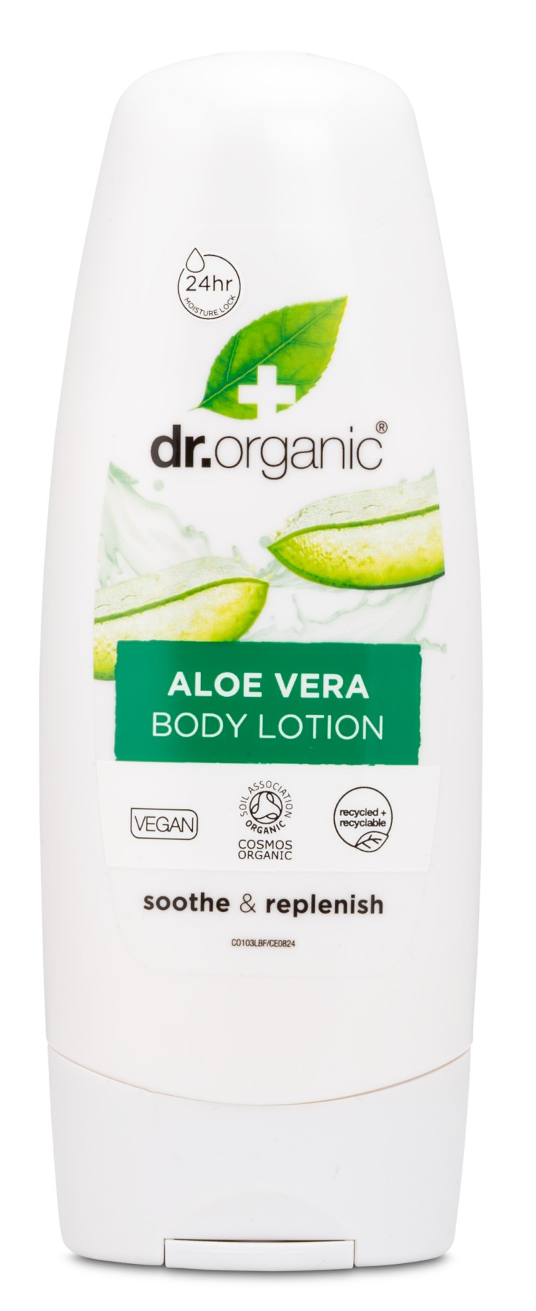 Næring af irriteret, beskadiget eller tør hud ved hjælp af Dr Organic Aloe Vera Skin Lotion. Denne lotion fra Dr Organic indeholder økologisk aloe vera, sheasmør, kakaosmør, oliven- og solsikkeolie samt irsk mos, der giver huden fugt og næring, mens den beroliges og blødgøres.
