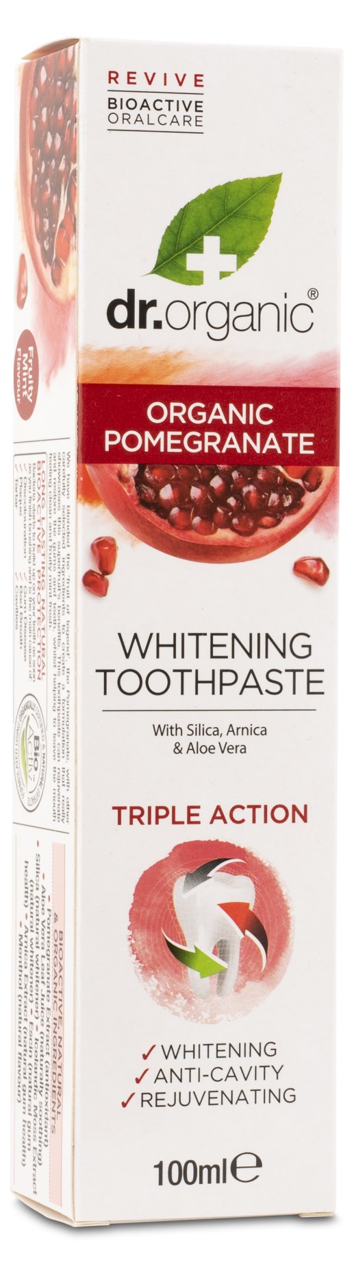 Dr Organic Pomegranate Tandpasta er en naturlig tandpasta, der fugter og genopretter tandkødet og tænderne, samtidig med at den efterlader en ren og frisk følelse. Tandpastaen har en trippelformel, der virker kariesforebyggende, hjælper med naturlig tandblegning og tilfører antioxidanter for en komplet mundplejeløsning. Indeholder antioxidantrige ingredienser som økologisk granatæble, silicium, islandsk mos og kastanje.