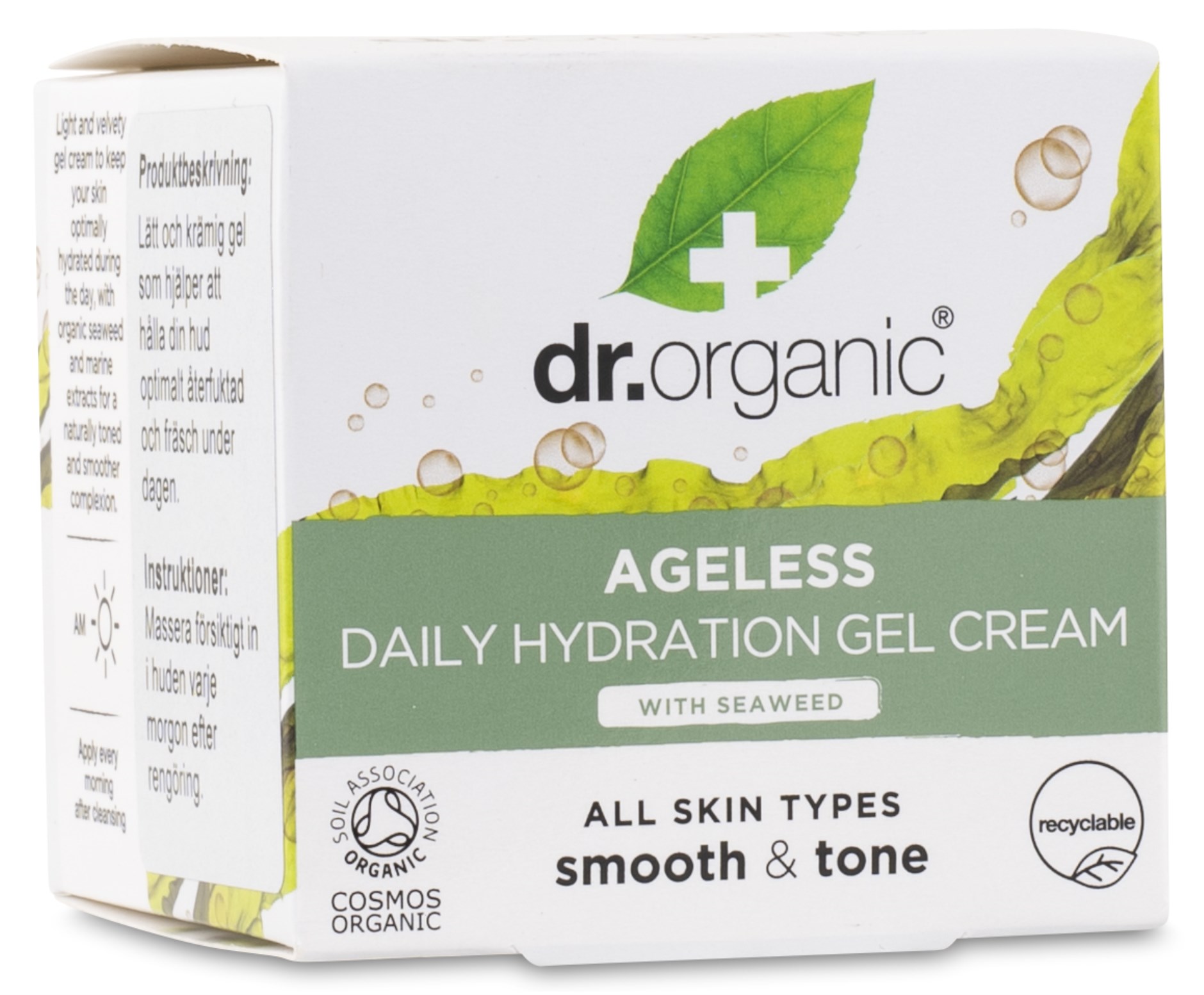 Fugt ansigtet med Dr Organic Seaweed Ageless Daily Hydration Gel Cream og føl dig frisk hele dagen! En dagcreme, der passer til alle hudtyper. Den har en geléagtig konsistens og virker udglattende. Med ingredienser som økologisk tang og rosmarinolie for en naturligt tonet og mere jævn hud. Tang er naturligt rig på C-vitamin.