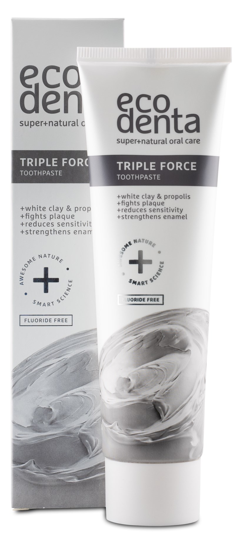 Triple Force Tandpasta fra Ecodenta passer ekstra godt til mundens følsomme områder! Indeholder hvidt ler og propolis, som hjælper med at bekæmpe plak, styrke emaljen og reducere tændernes og tandkødets følsomhed. Hele 98 procent af indholdet er af naturlig oprindelse.