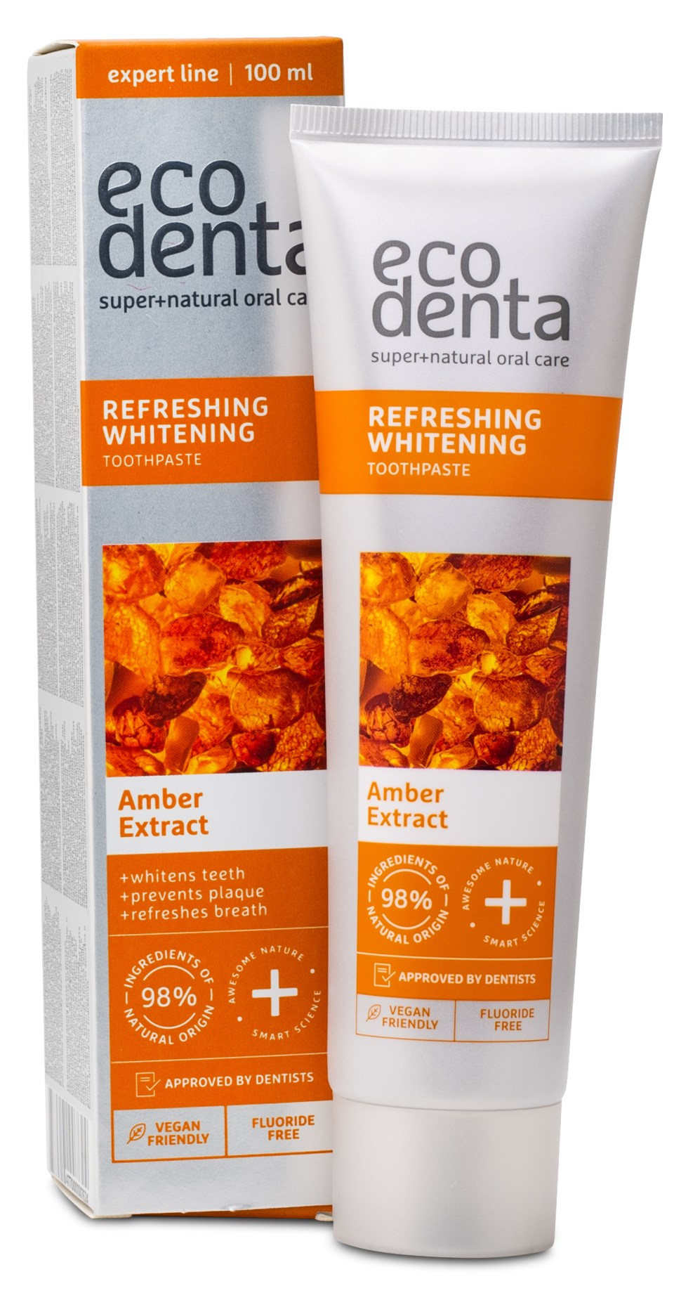 Ecodenta Expert Line Whitening Toothpaste er en vegansk tandpasta med den specielle ingrediens rav. Med en innovativ formel modvirker den misfarvninger og giver dig et friskere smil. Tilsat xylitol bidrager til en normal spytproduktion, der forsinker plakdannelse. Brug dagligt for bedste effekt. Tandpastaen er fri for fluor.