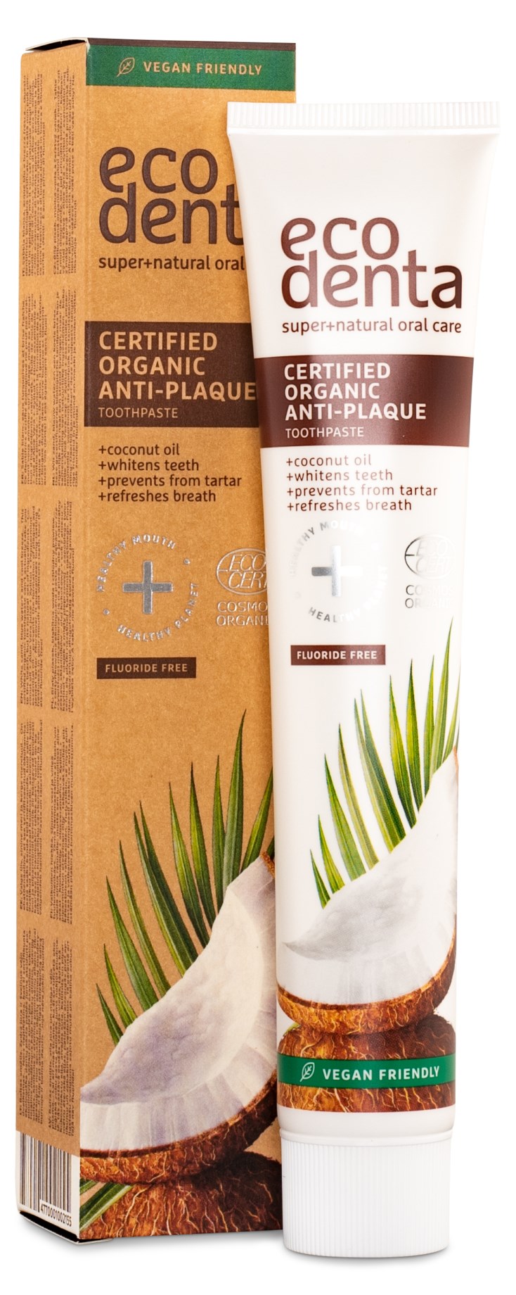 Ecodenta Organic Line Anti-plaque tandpasta er en fluorfri tandpasta med naturlige ingredienser. Den indeholder kokosolie, som har en naturlig og skånsom blegningseffekt, samt aloe vera, xylitol og pebermynteolie. Tandpastaen hjælper med at forhindre plakdannelse og tandsten samt giver dig en frisk ånde.