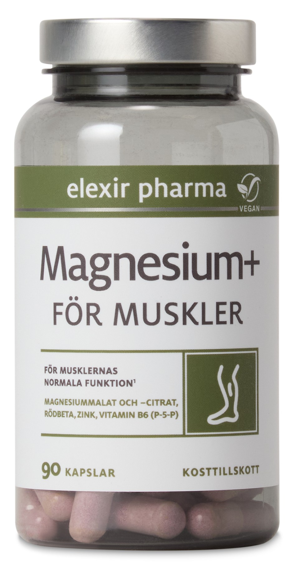 Elexir Pharma Magnesium+ til muskler indeholder to organiske former for magnesium – magnesiumcitrat og magnesiummalat – som begge har høj biotilgængelighed. Tilskuddet er desuden beriget med zink, vitamin B6 (P-5-P) samt rødbedeekstrakt. Både magnesium og vitamin B6 bidrager til at mindske træthed og udmattelse, mens rødbedeekstrakt er rigt på nitrater. Mangel på magnesium kan blandt andet vise sig som kramper i benene.