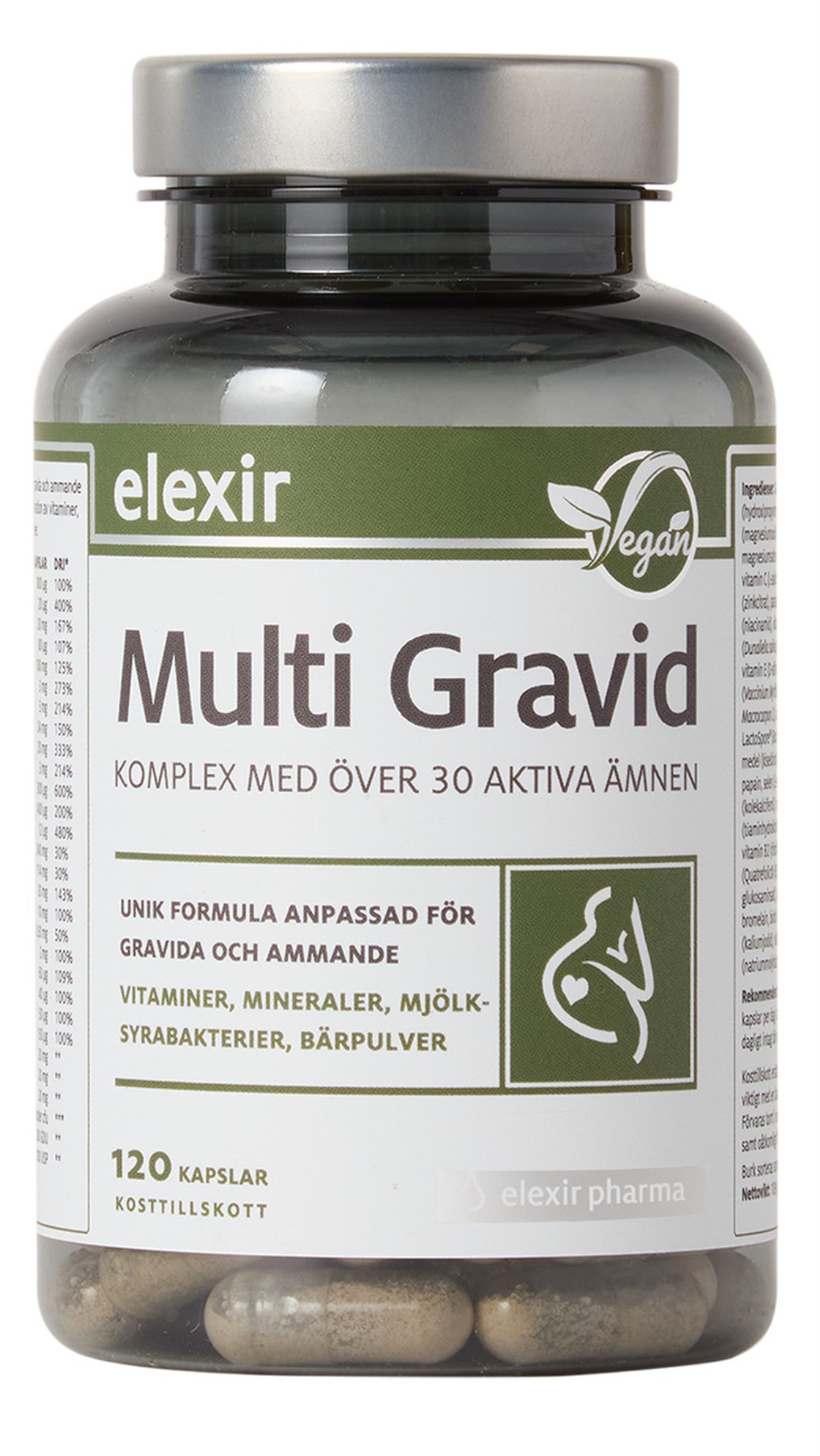 Føl dig tryg gennem hele graviditeten og ammeperioden med MultiGravid fra Elexir Pharma, et multitilskud med næring fra vitaminer, mineraler, bærpulver og enzymer for maven. Et alt-i-et-produkt, der hjælper dig på vej til den rette næring i en af livets vigtigste perioder. Elexir Pharma MultiGravid indeholder alle de vitaminer og mineraler, du har brug for i tilstrækkelige doser for at sikre indtaget fra kosten. Derudover indgår ekstra høj mængde folsyre og jern, som anbefales under graviditet. Produktet indeholder methyleret folat (folsyre), som kroppen nemt kan optage. Folsyre bidrager til normal fosterudvikling. Jern bidrager til normal blodproduktion og ilttransport og findes i en form, der er skånsom mod maven. Derudover er bærpulver fra blandt andet blåbær og tranebær tilsat for naturlig næring. Også udvalgte fordøjelsesenzymer og mælkesyrebakterier er inkluderet for mavens skyld. Brug som et dagligt tilskud med 2 kapsler om dagen.