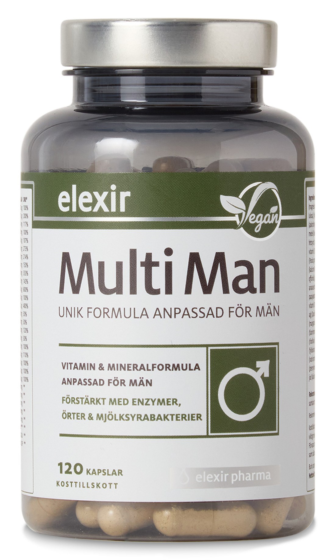 Elexir Pharma Multi Mand er et komplet multivitamin med over 30 aktive stoffer. Med en unik kombination af vitaminer, mineraler, urter, enzymer og mælkesyrebakterier, er det perfekt til dig, der vil have det hele i samme produkt. Kosttilskuddet indeholder ikke jern, da mænd sjældent har behov for ekstra jern. Elexir Pharma Multi Mand indeholder i stedet alle de andre vigtige vitaminer og mineraler, hvilket gør det til et fuldendt tilskud særligt til mænd.