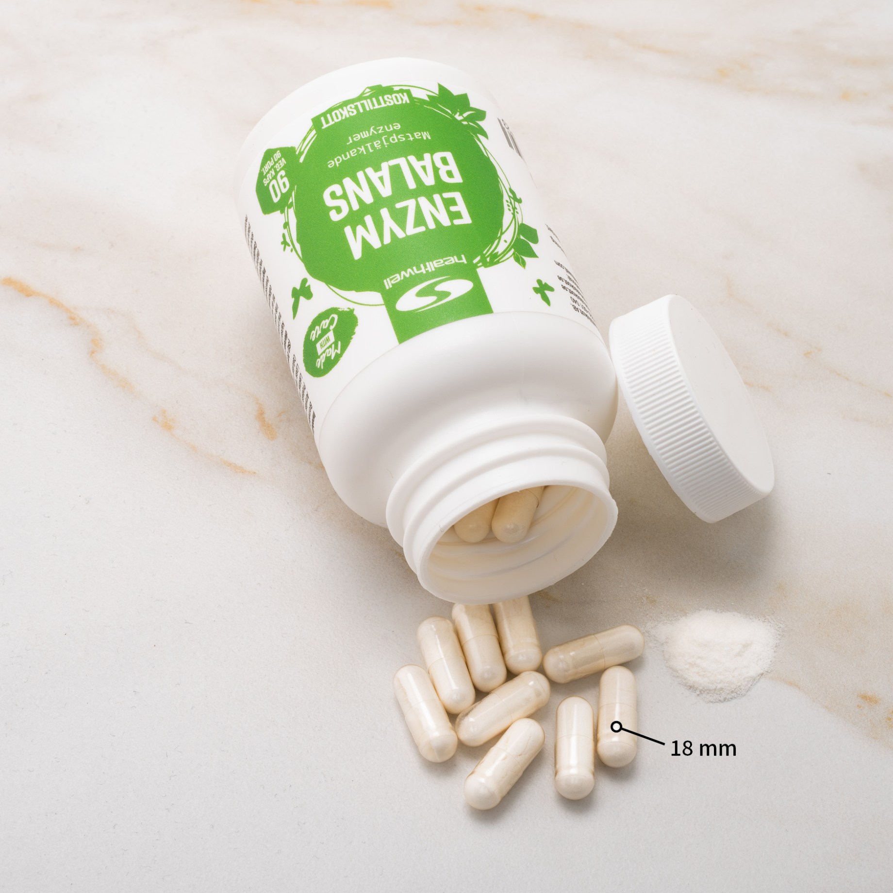 Enzym Balance kapsler er sammensat af vegetabilske ingredienser i form af cellulose og kokosolie. For at bevare alle aktive ingredienser i Healthwells kosttilskud presses kapslerne sammen ved hjælp af koldpressning, hvilket er en skånsom produktionsmetode.