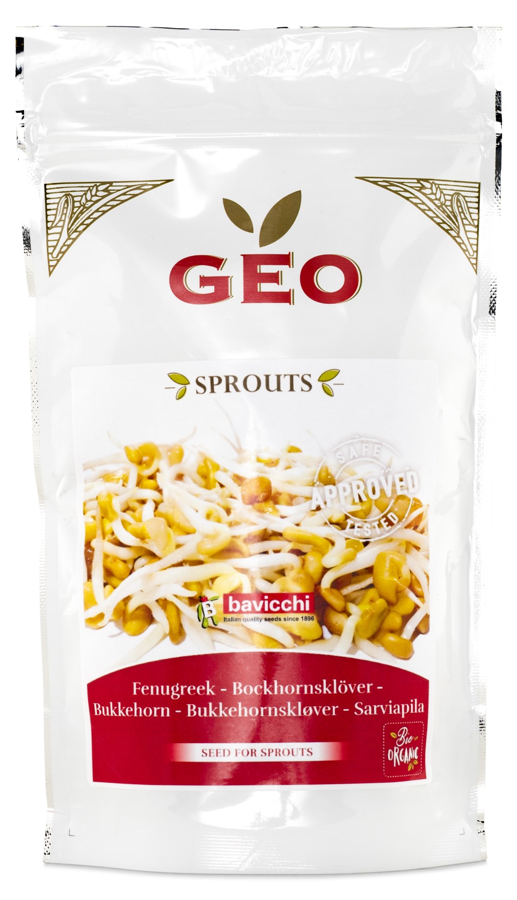 GEO Bukkehornfrø ØKO er spirefrø af det orientalske frø bukkehorn. Bukkehornskløver er en vigtig ingrediens som krydderi i karry, men kan også spires for at få krydrede og næringsrige spirer. Spirerne er meget rige på protein (23 %) samt mineraler som magnesium, calcium, zink og jern. De anses også for at være gavnlige for fordøjelsen.