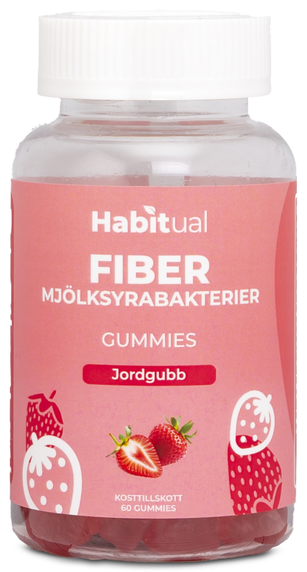 Habitual Fiber/Mælkesyrebakterie Gummies er sukkerfrie vingummier med jordbærsmag, kostfibre og en inaktiveret mælkesyrebakterieblanding til dig, der vil give ekstra støtte til tarmfloraen og fordøjelsen. En til to gummies med jordbærsmag om dagen er en nem måde at få fibre og mælkesyrebakterier på.