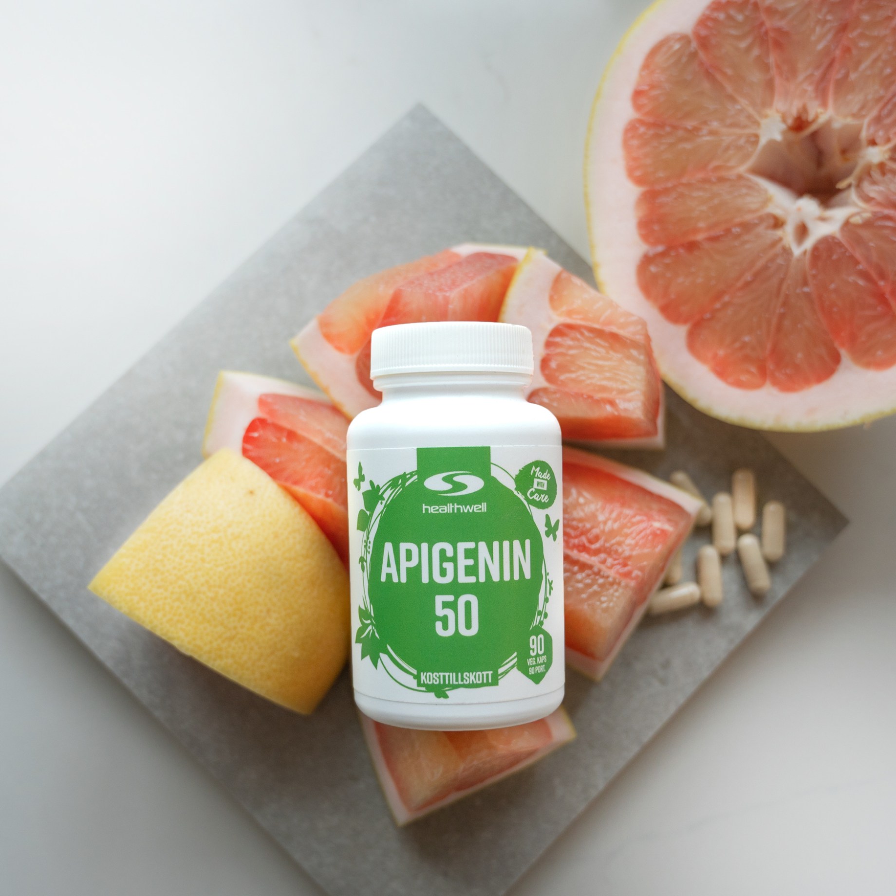 Healthwell Apigenin 50 indeholder det interessante stof apigenin fra pomelo, den største frugt i citrusfamilien. Apigenin er en flavonoid, der findes naturligt i forskellige frugter, grøntsager og urter, herunder kamille, selleri og persille. Apigenin er for nylig blevet mere omtalt for sine unikke egenskaber, men har en lang traditionel anvendelse inden for kinesisk lægekunst. Det er et fytonæringsstof med antioxidante egenskaber og er blevet studeret i forbindelse med cellernes beskyttelsesmekanismer. Apigenin ser også ud til at binde til GABA-A-receptorerne og kan derfor være nyttig, når vi vil slappe af.