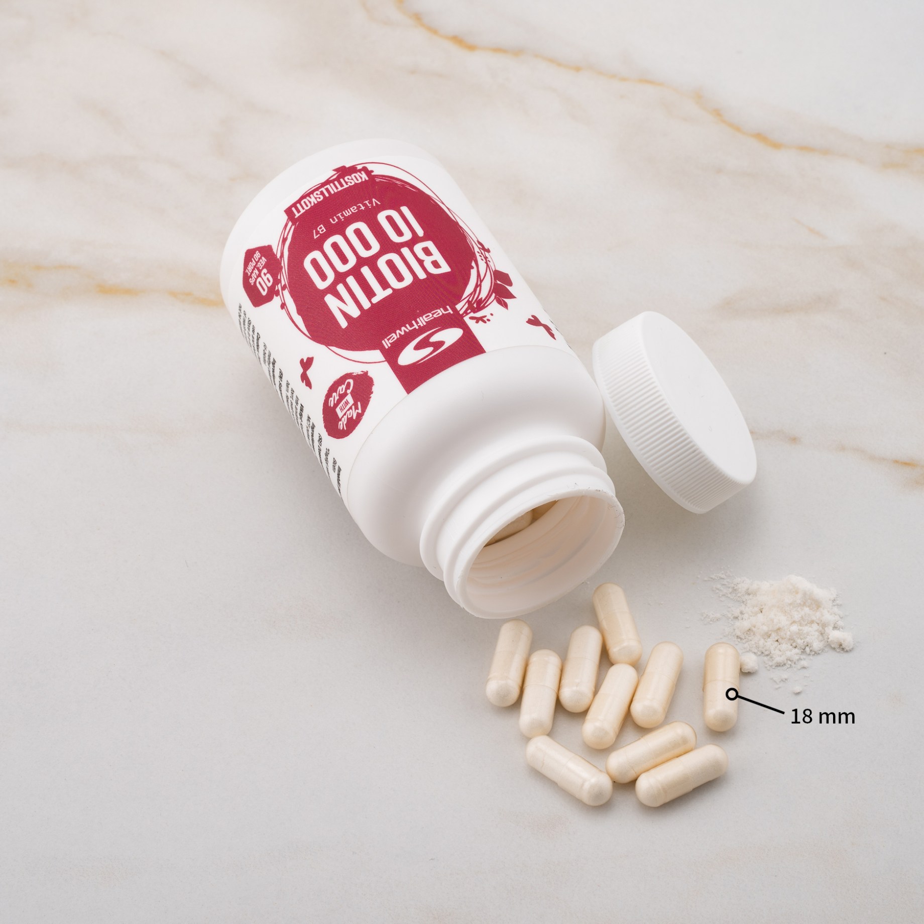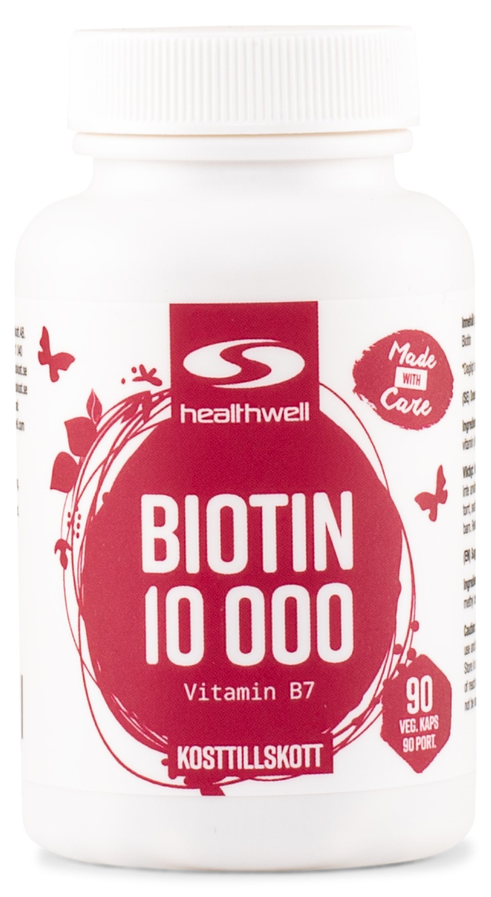 Healthwell Biotin 10000 indeholder hele titusind mikrogram (mcg) biotin, vitamin B7. Dette gør tilskuddet til vores mest koncentrerede og effektive hidtil; vi har også Biotin 5000, Biotin 1000 og Biotin 500. Healthwell Biotin 10000 er tilskuddet for dig, der ønsker at understøtte normalt hud, hår og negle, men det bidrager også til en normal energiomsætning og normal funktion i centralnervesystemet. Biotin er dog mest kendt i skønhedstilskud og bliver takket være sin virkning på hårkvaliteten ofte omtalt som H-vitamin. Dette højtdoserede tilskud gør det nemt for dig at få en større mængde biotin uden at skulle kombinere flere forskellige tilskud.