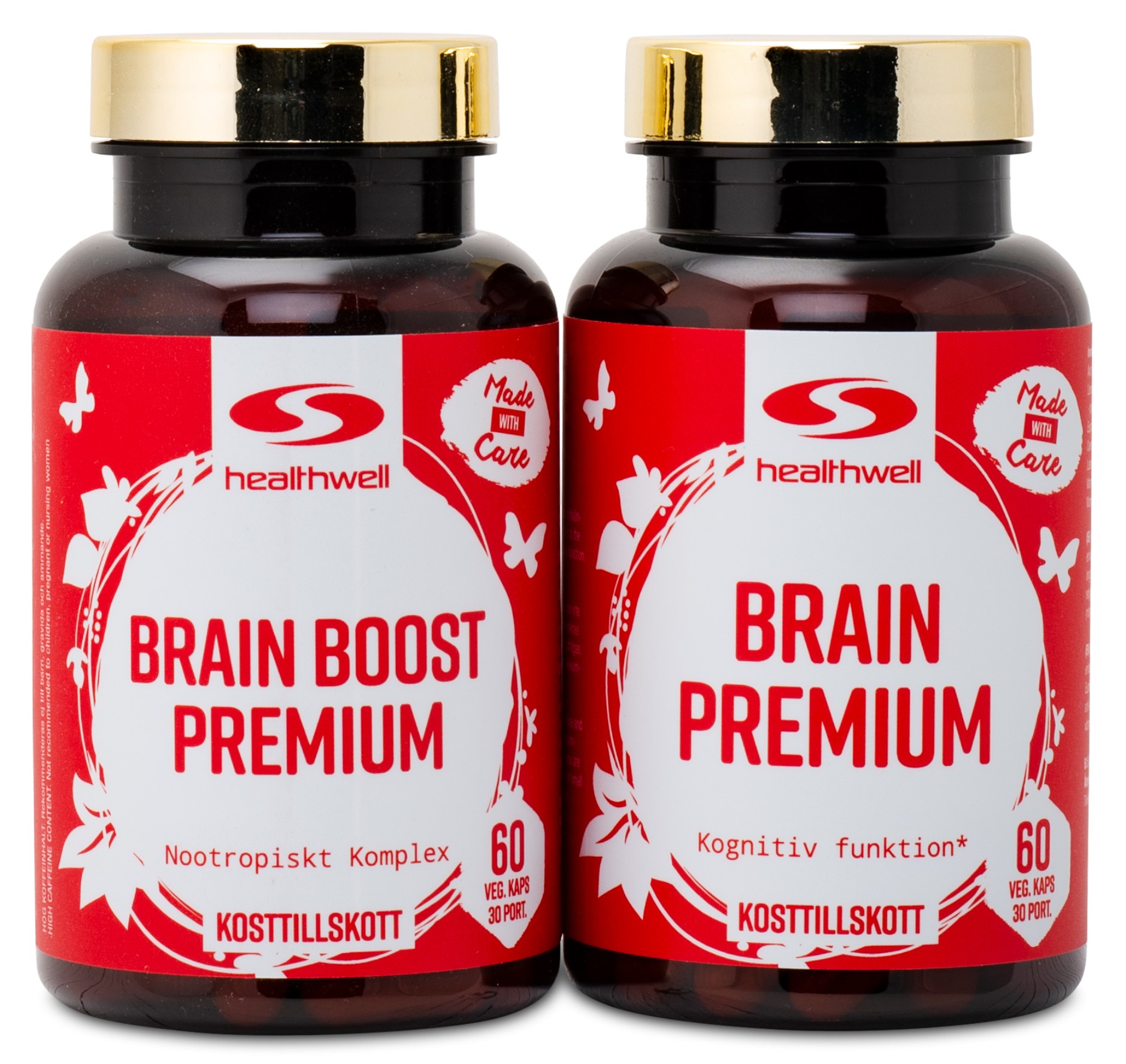 Healthwell Brain Premium og Healthwell Brain Boost Premium er højdoserede kosttilskud til din mentale præstation og hjerne med fokus på både kortsigtet og langsigtet kognitiv formåen. Healthwell Brain Premium indeholder et kraftfuldt kompleks, der er tilpasset til at vedligeholde og støtte den mentale funktion over tid. Komplekset består blandt andet af ALC, Euphoria longana-ekstrakt og Q10. Det indeholder også vitamin B12 og B6, der bidrager til normal psykologisk funktion. Læs mere om Healthwell Brain Premium.