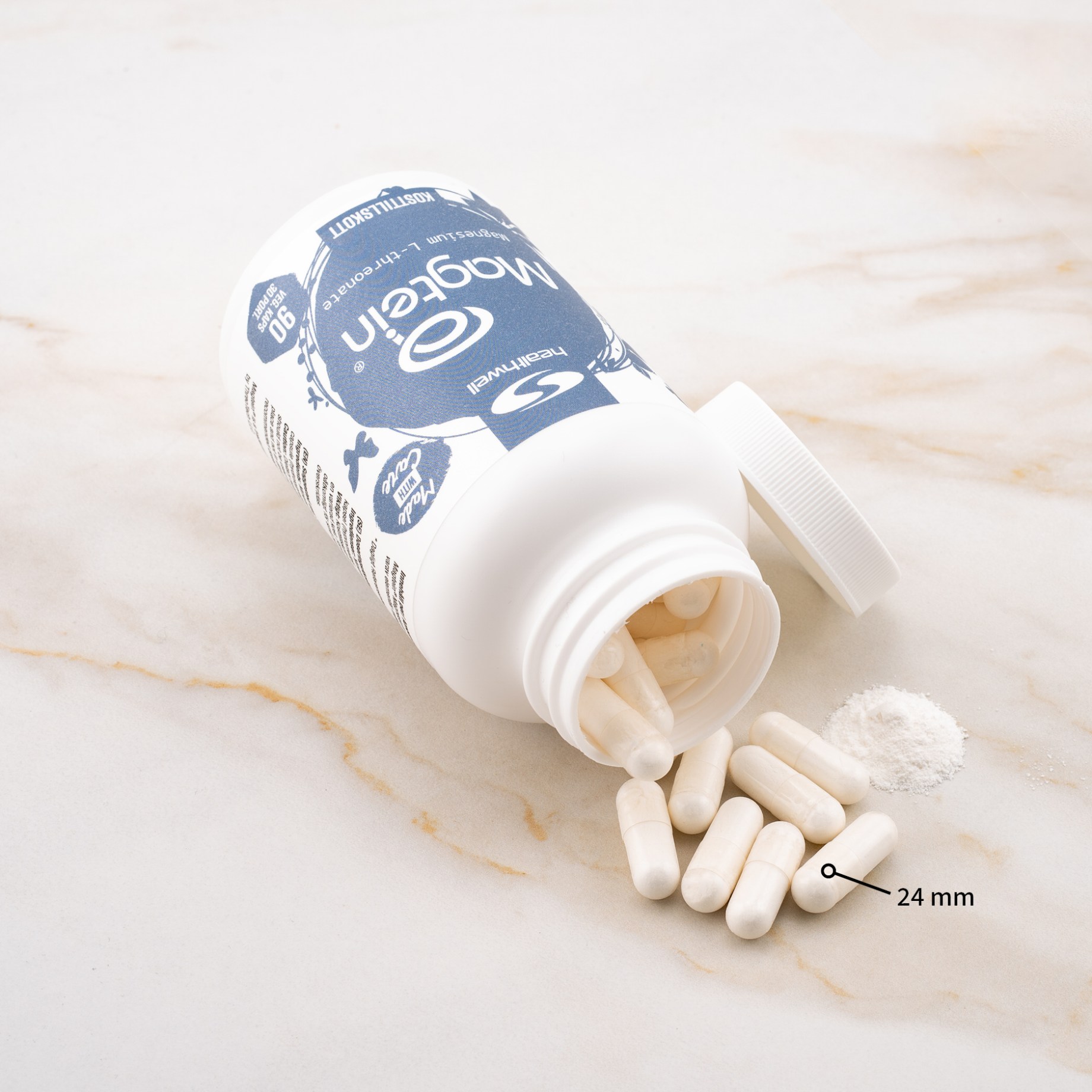 Pas på dine mentale evner med Healthwell Magtein Magnesium L-threonate! Kosttilskuddet indeholder en patenteret form for magnesium L-treonat. Formen har unikke egenskaber og er den eneste form for magnesium, der kan krydse blod-hjernebarrieren og dermed påvirke niveauerne af magnesium i hjernen. Magtein er desuden den eneste godkendte form for magnesium L-treonat i EU. Magnesium har mange beviste fordele for kroppen, herunder bidrager det til normal psykologisk funktion og hjælper med at reducere træthed og udmattelse.