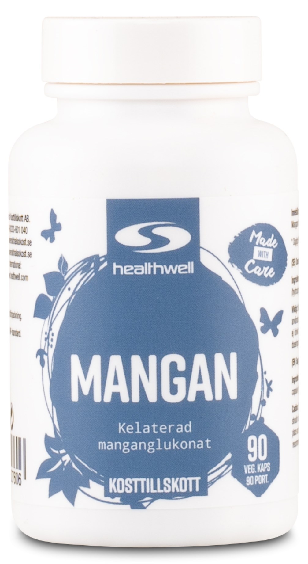 Healthwell Mangan indeholder mineralet mangan i chelateret form. En gavnlig form, som let optages af kroppen. Mangan bidrager blandt andet til at opretholde normal knoglestruktur, til den normale dannelse af bindevæv og til at beskytte cellerne mod oxidativ stress. Healthwell Mangan indeholder 5 mg mangan pr. kapsel i vegetabilske kapsler.